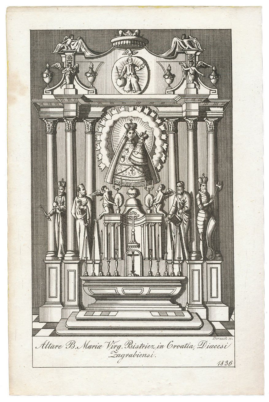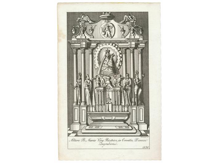 Opis: MARIJA BISTRICA, Oltar Blažene Djevice Marije u Mariji Bistrici, originalni naslov Altare B. Mariae Virg. Bistricz in Croatia, Dioecesi Zagrabiensi. 1836. Grafika iz knjige Jordanszky Elek: A Magyar Országban 's az ahoz tartozó részekben lévő Boldogságos Szűz Mária Kegyelem' képeinek rövid leírása, Pozsony (današnja Bratislava u Slovačkoj), 1836. Dimenzija slike 18.5x11 cm.