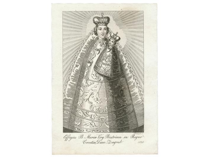 Opis: MARIJA BISTRICA, Slika kipa Blažene Djevice Marije u Mariji Bistrici, originalni naslov Effigies B. Mariae Virg. Bistricen in Regno Croatia, Dioec. Zagrab. 1836. Grafika iz knjige Jordanszky Elek: A Magyar Országban 's az ahoz tartozó részekben lévő Boldogságos Szűz Mária Kegyelem' képeinek rövid leírása, Pozsony (današnja Bratislava u Slovačkoj), 1836. Dimenzija slike 16.5x11 cm.