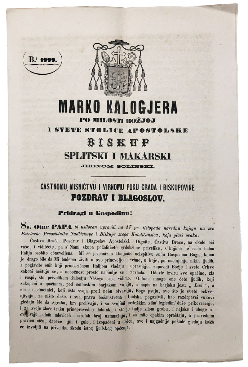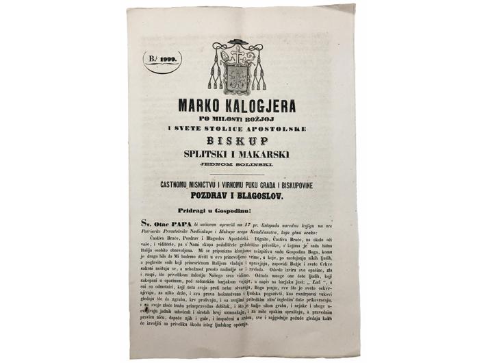Opis: Marko Kalogjera ... biskup splitski i makarski, jednom solinski, častnomu misničtvu i virnomu puku grada i biskupovine pozdrav i blagoslov. Split, Tiskarnica Ivana Krstitelja Soregotti, 1867. Biskupska poslanica na hrvatskom i talijanskom jeziku. 8 str, stanje odlično. 22x33,5 cm