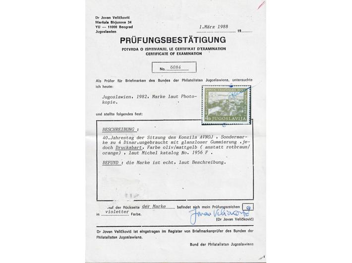 Opis: Michel br. 1956 pogreška boje, maslinastozelena umjesto naranđastosmeđe. Odlična kvaliteta, fotoatest Veličković.