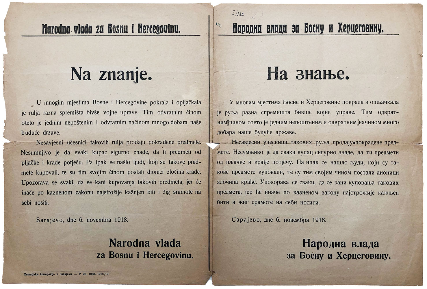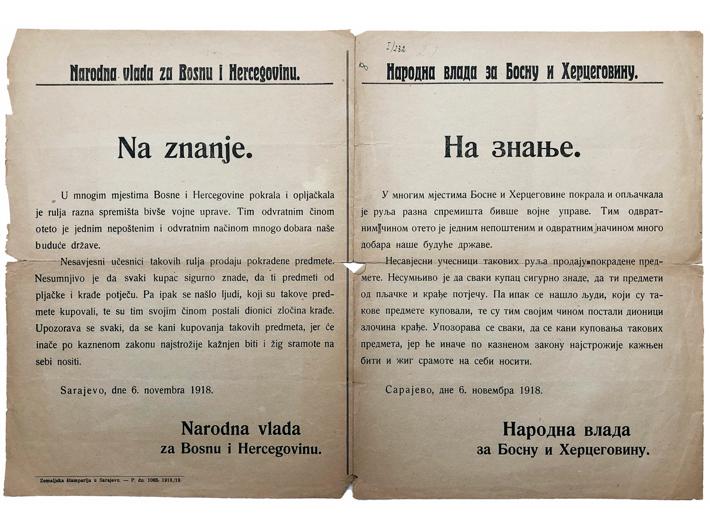 NA ZNANJE, proglas Narodne vlade za Bosnu i Hercegovinu. 6. 11. 1918. Opis: NA ZNANJE, proglas Narodne vlade za Bosnu i Hercegovinu. 6. 11. 1918. Proglas kojim se želi zaustaviti prodaja ukradene vojne opreme. List s jedne strane na latinici, s druge na ćirilici. 25x34 cm. Stanje vrlo dobro. NA ZNANJE, proglas Narodne vlade za Bosnu i Hercegovinu. 6. 11. 1918. Aukcija: Aukcija br. 67 - Numizmatika, militarija Kataloški broj: 528 Kategorija: Dokumenti i ostalo Trenutna ponuđena cijena je 10EUR, ukoliko želite dati svoju ponudu ona mora biti barem 10EUR ili veća. Upišite vrijednost vaše ponude: Ostali predmeti iz kategorije: Dokumenti i ostalo 524 40 EUR 525 75 EUR 526 45 EUR 527 100 EUR 528 10 EUR 529 10 EUR 530 150 EUR 531 35 EUR 532 120 EUR 533 20 EUR 534 12 EUR 535 20 EUR 536 8 EUR 537 17 EUR 538 40 EUR 539 6 EUR 540 30 EUR 541 30 EUR 542 60 EUR 543 25 EUR 1234→