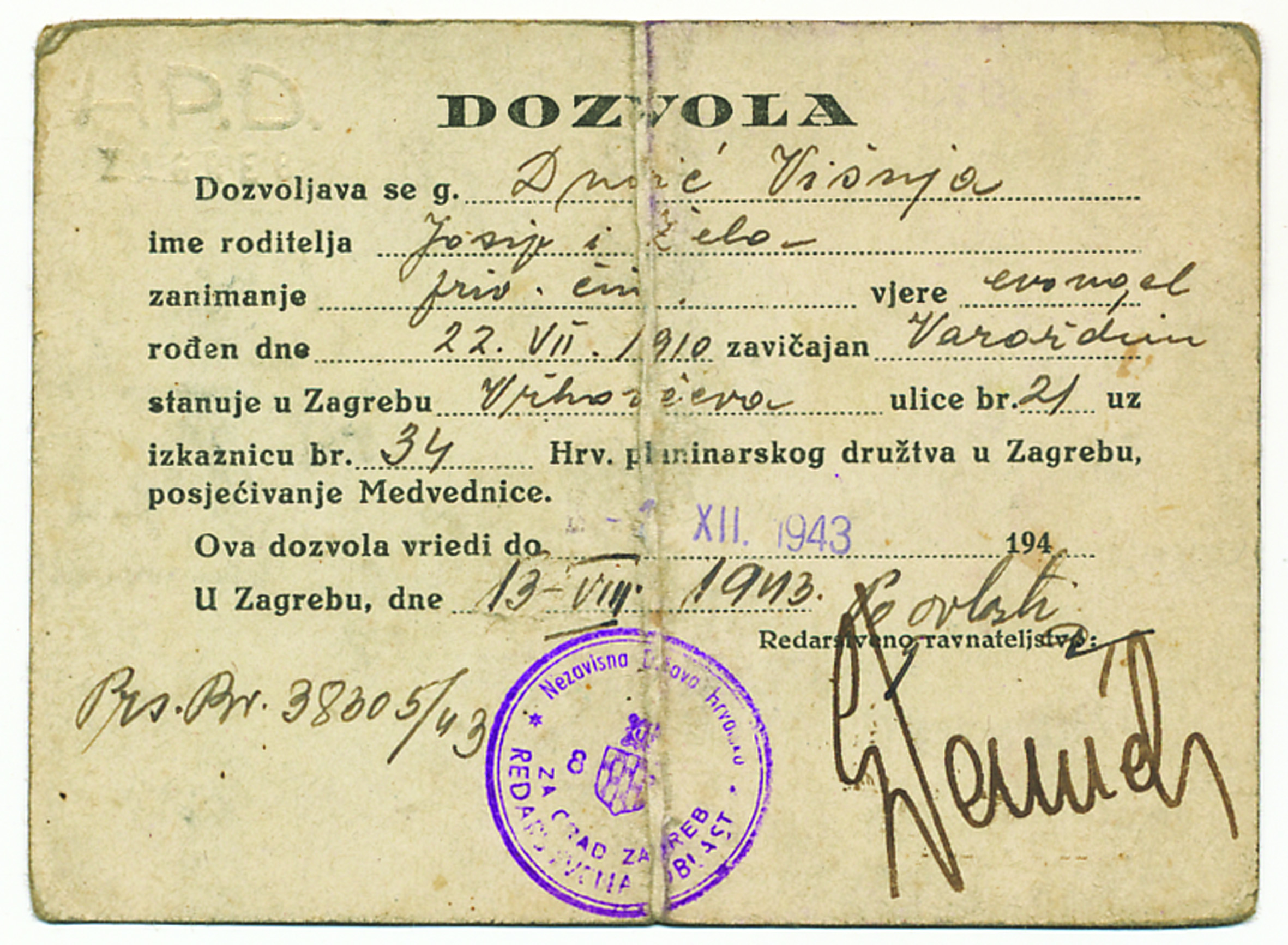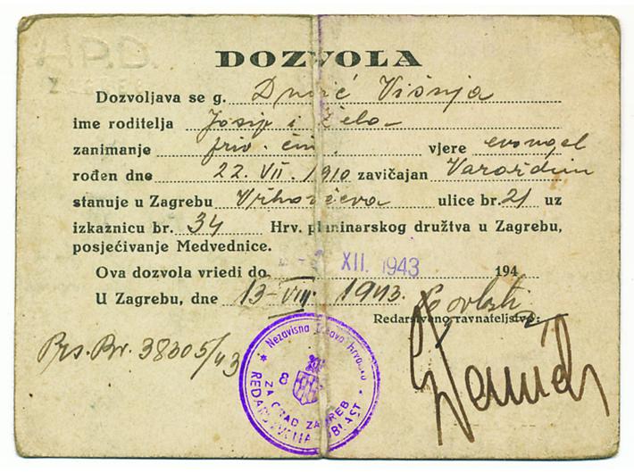 NDH, dozvola/propusnica Hrvatskog planinarskog društva za posjećivanje Medvednice. Zagreb, 1943. Opis: NDH, dozvola/propusnica Hrvatskog planinarskog društva za posjećivanje Medvednice. Zagreb, 1943. 12x9 cm. NDH, dozvola/propusnica Hrvatskog planinarskog društva za posjećivanje Medvednice. Zagreb, 1943. Aukcija: Aukcija br. 67 - Numizmatika, militarija Kataloški broj: 546 Kategorija: Dokumenti i ostalo Trenutna ponuđena cijena je 30EUR, ukoliko želite dati svoju ponudu ona mora biti barem 30EUR ili veća. Upišite vrijednost vaše ponude: Ostali predmeti iz kategorije: Dokumenti i ostalo 524 40 EUR 525 75 EUR 526 45 EUR 527 100 EUR 528 10 EUR 529 10 EUR 530 150 EUR 531 35 EUR 532 120 EUR 533 20 EUR 534 12 EUR 535 20 EUR 536 8 EUR 537 17 EUR 538 40 EUR 539 6 EUR 540 30 EUR 541 30 EUR 542 60 EUR 543 25 EUR 1234→