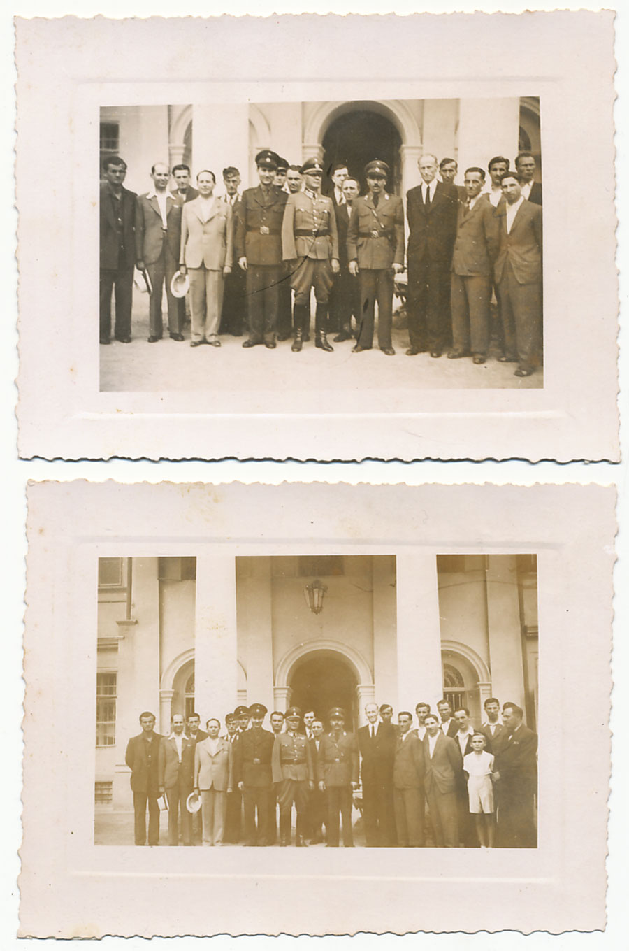Opis: NDH GENERAL SLAVKO ŠTANCER, lot 2 fotografije. Januševec, 1943. Fotografije generala Slavka Štancera (u sredini bez ruke) s grupom civila i ustaša ispred dvorca Januševac. 11x8 cm.