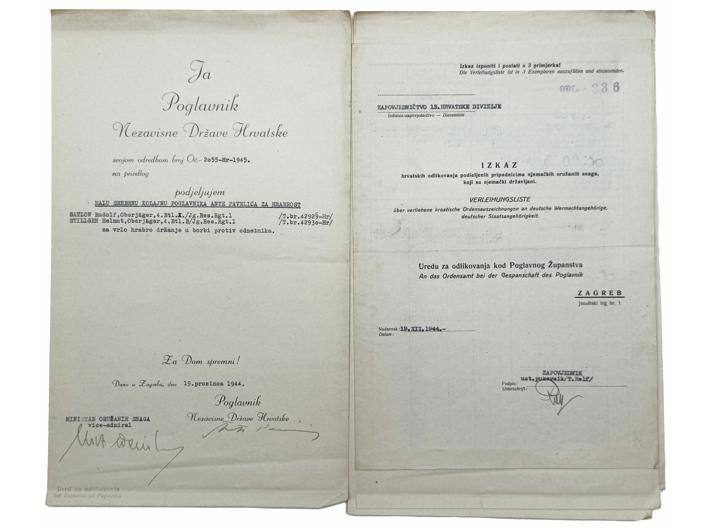 Opis: NDH, kompletan spis o dodjeli mele srebrne kolajne AP za hrabrost iz 19.prosinca 1944., Originalni potpisi Ante Pavelića i Nikole Steinfela (ministar oružanih snaga NDH)