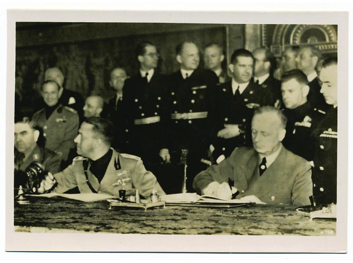 NDH, potpisivanje Trojnog pakta, fotografija. 15. 6. 1941. Opis: NDH, potpisivanje Trojnog pakta, fotografija. 15. 6. 1941. Na fotografiji Ante Pavelić, Galeazzo Ciano, Joachim von Ribbentrop. 14,5x10,5 cm. NDH, potpisivanje Trojnog pakta, fotografija. 15. 6. 1941. Aukcija: Aukcija br. 67 - Numizmatika, militarija Kataloški broj: 501 Kategorija: Fotografije i promičba Trenutna ponuđena cijena je 25EUR, ukoliko želite dati svoju ponudu ona mora biti barem 30EUR ili veća. Upišite vrijednost vaše ponude: Ostali predmeti iz kategorije: Fotografije i promičba 474 30 EUR 475 40 EUR 476 30 EUR 477 8 EUR 478 16 EUR 479 14 EUR 480 55 EUR 481 16 EUR 482 15 EUR 483 30 EUR 484 4 EUR 485 200 EUR 486 80 EUR 487 180 EUR 488 25 EUR 489 45 EUR 490 45 EUR 491 65 EUR 492 170 EUR 493 220 EUR 123→