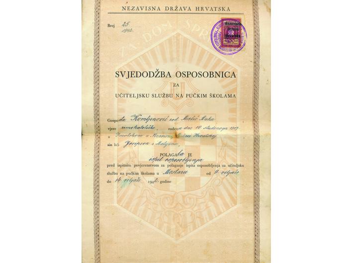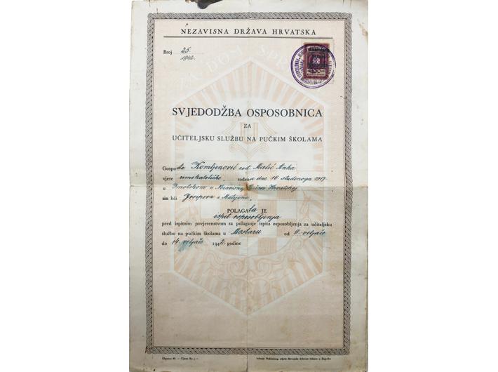 NDH, Svjedodžba osposobnica za učiteljsku službu na pučkim školama, izdana u Mostaru 1942. Opis: NDH, Svjedodžba osposobnica za učiteljsku službu na pučkim školama, izdana u Mostaru 1942. Ovjerena žigom Povjerenstva za polaganje praktičnoga učiteljskog ispita u Mostaru i taksenom markom. Stanje dobro. NDH, Svjedodžba osposobnica za učiteljsku službu na pučkim školama, izdana u Mostaru 1942. Aukcija: Aukcija br. 67 - Numizmatika, militarija Kataloški broj: 540 Kategorija: Dokumenti i ostalo Trenutna ponuđena cijena je 30EUR, ukoliko želite dati svoju ponudu ona mora biti barem 30EUR ili veća. Upišite vrijednost vaše ponude: Ostali predmeti iz kategorije: Dokumenti i ostalo 524 40 EUR 525 75 EUR 526 45 EUR 527 100 EUR 528 10 EUR 529 10 EUR 530 150 EUR 531 35 EUR 532 120 EUR 533 20 EUR 534 12 EUR 535 20 EUR 536 8 EUR 537 17 EUR 538 40 EUR 539 6 EUR 540 30 EUR 541 30 EUR 542 60 EUR 543 25 EUR 1234→