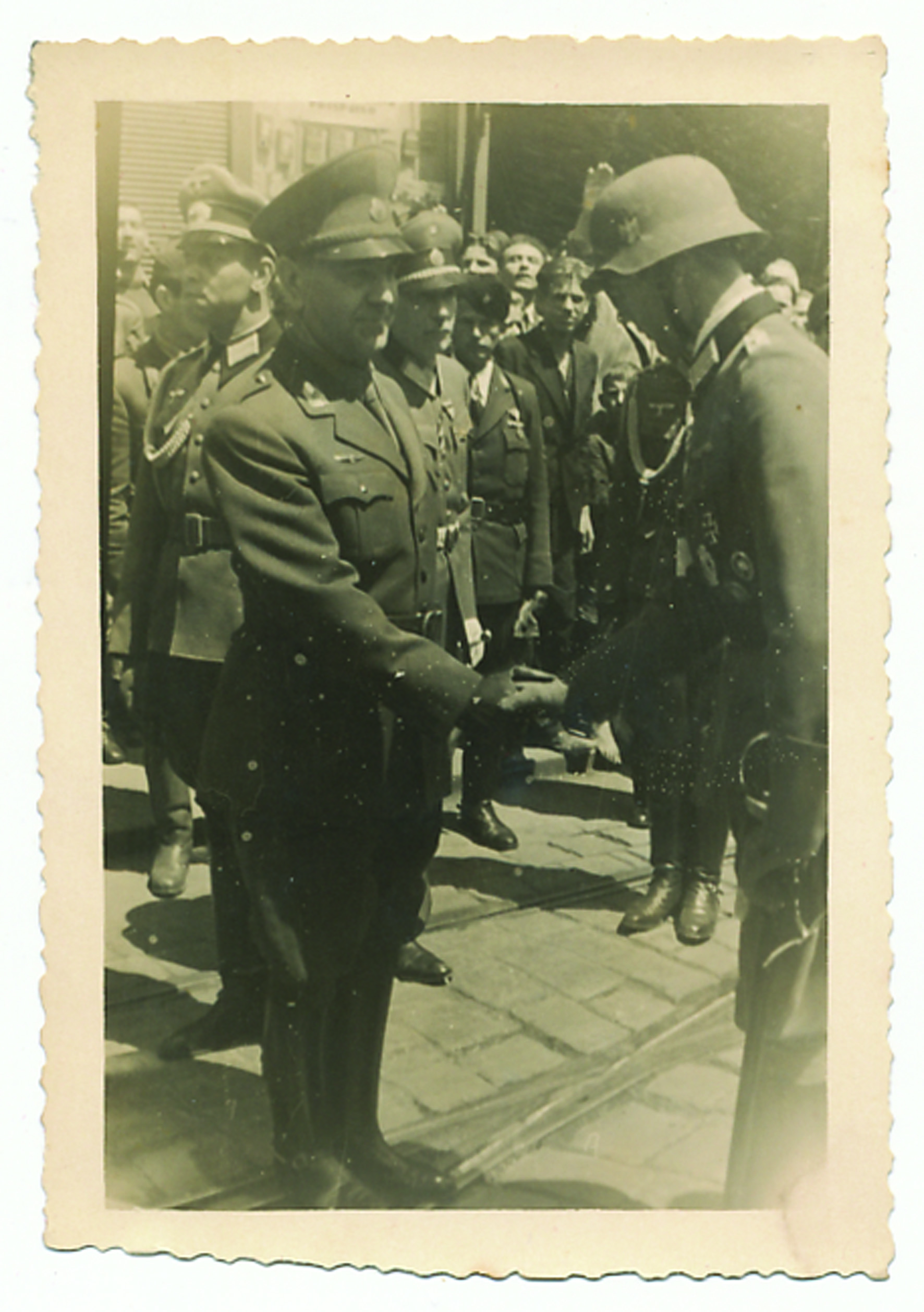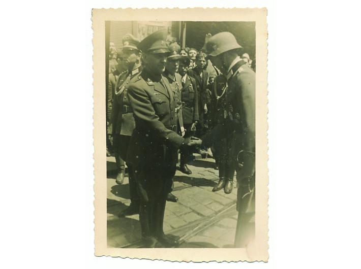 Opis: NDH, visoki časnik Hrvatske legije pozdravlja poglavnika ANTE PAVELIĆA, ispraćaj Hrvatske legije u Zagrebu, 1941. Fotografija: 7x10,5 cm.