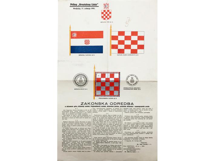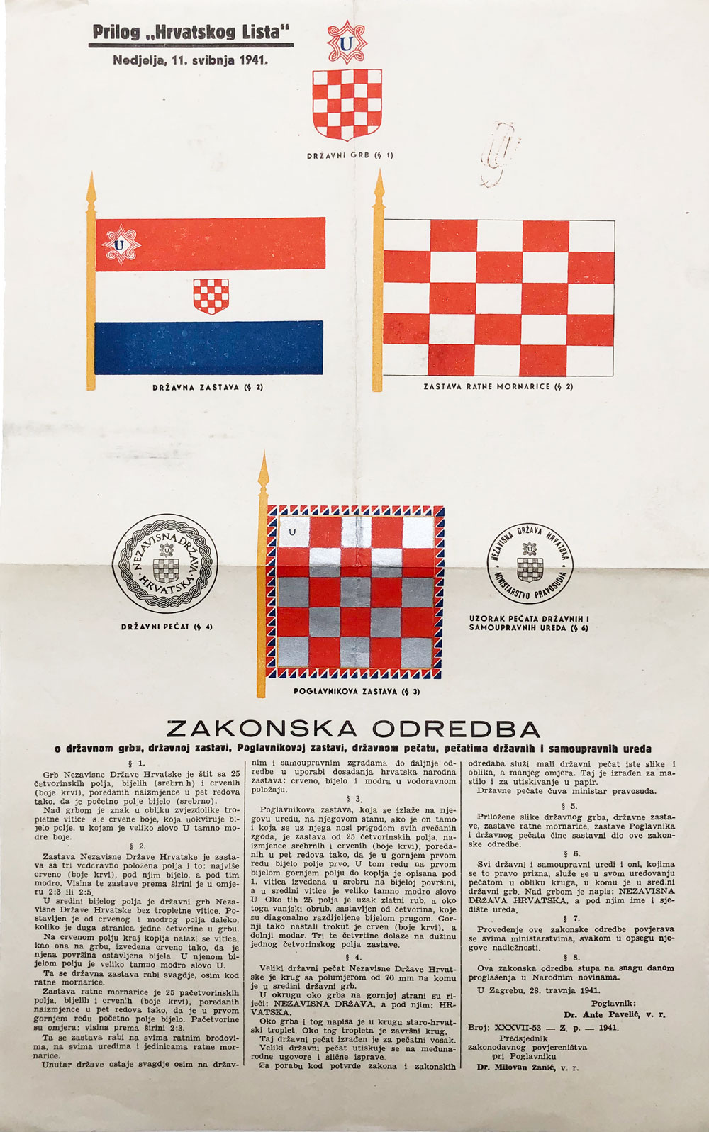 Opis: NDH, zakonska odredba o državnom grbu, zastavi i pečatu. Prilog "Hrvatskog Lista", 11. 5. 1941. Zakonska odredba o državnom grbu, državnoj zastavi, Poglavnikovoj zastavi, državnom pečatu, pečatima državnih i samoupravnih ureda. 40x25 cm. Stanje odlično.