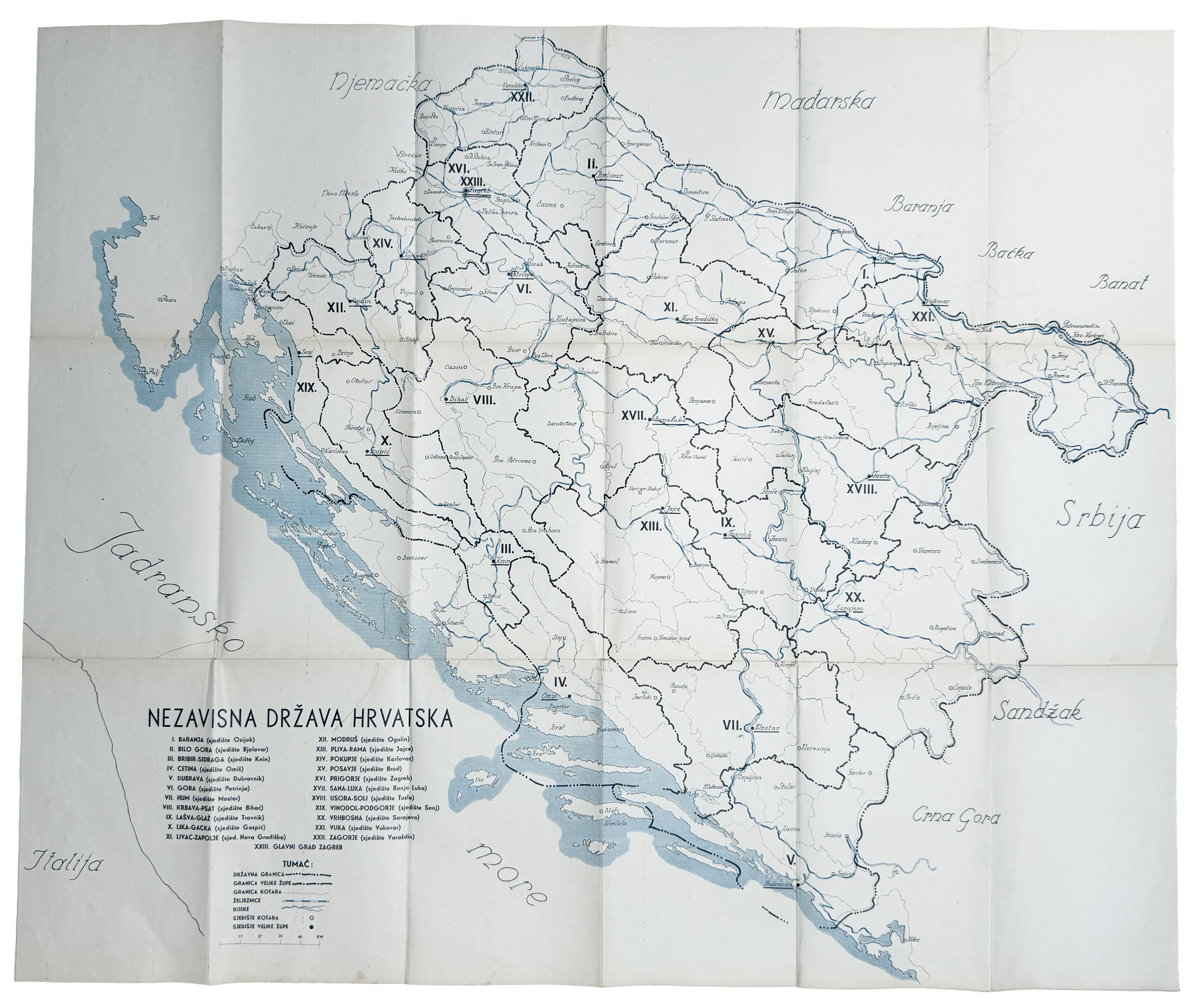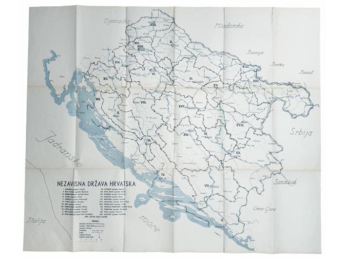 • NDH, zemljovid podjele na župe i kotare s popisom svih 23 župa, 1941/43, dekorativno, 82x69 cm