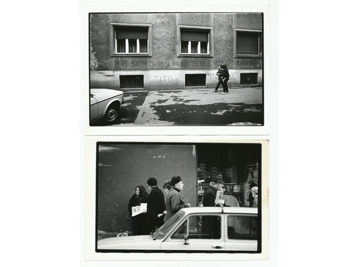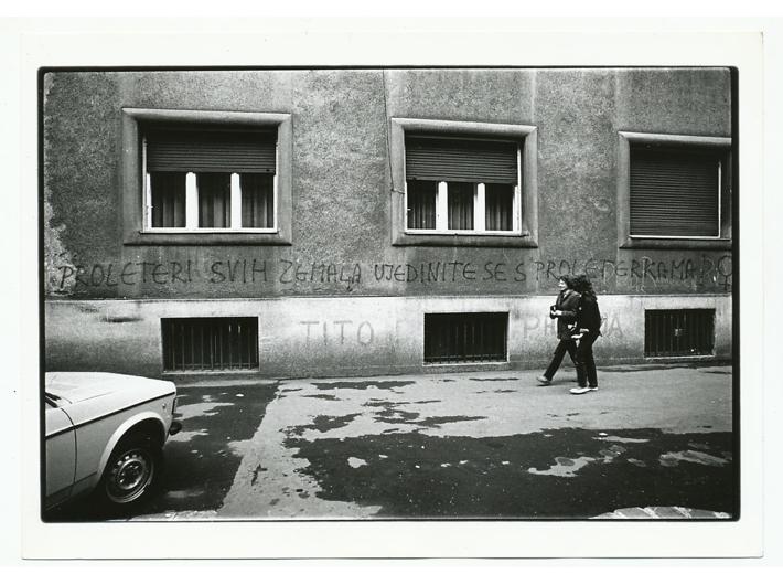 Opis: Nikša Antonini, lot 4 fotografije sa zagrebačkim motivima, oko 1980. Između ostalih, fotografija grafita u Vodnikovoj ulici "Proleteri svih zemalja ujedinite se s proleterkama Tito Partija". Crno-bijele fotografije, dimenzija 18x23 cm. Stanje odlično.