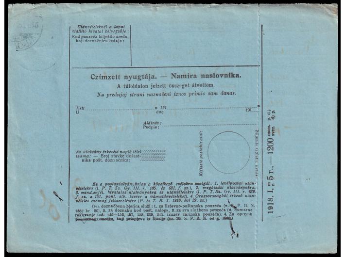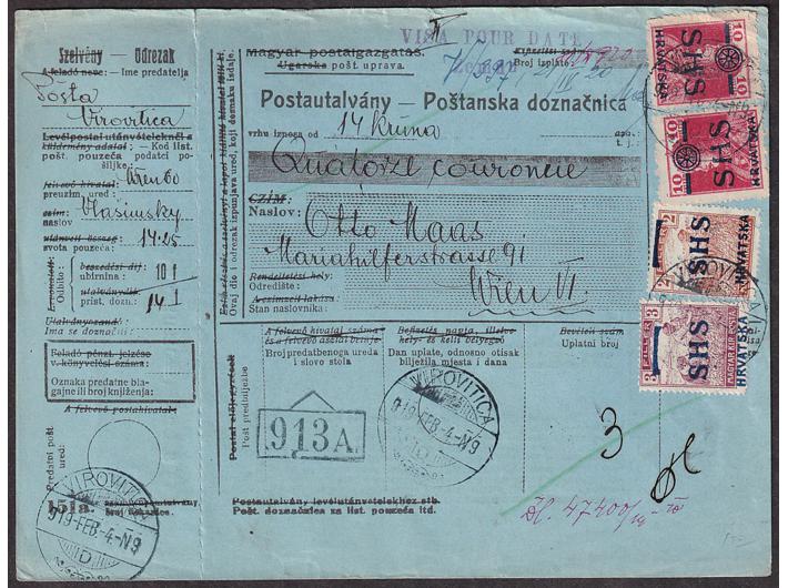 Opis: Novčana uputnica poslana iz Virovitice u Beč 04.02. 1919. frankirana markama sa pretiskom SHS HRVATSKA. Dobra kvaliteta.