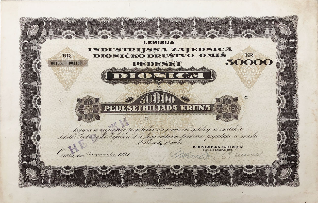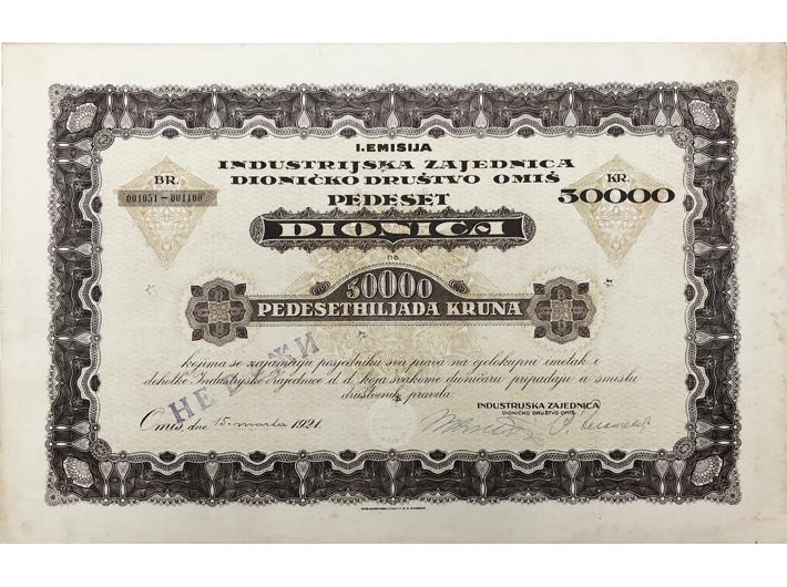 OMIŠ, dionica "INDUSTRIJSKA ZAJEDNICA" d.d., 50 000 kruna, 15. ožujak 1921., 39x25 cm Opis: OMIŠ, dionica "INDUSTRIJSKA ZAJEDNICA" d.d., 50 000 kruna, 15. ožujak 1921., 39x25 cm OMIŠ, dionica "INDUSTRIJSKA ZAJEDNICA" d.d., 50 000 kruna, 15. ožujak 1921., 39x25 cm Aukcija: Aukcija br. 70 - Numizmatika, militarija Kataloški broj: 2139 Kategorija: Dionice - Hrvatska Trenutna ponuđena cijena je 18EUR, ukoliko želite dati svoju ponudu ona mora biti barem 20EUR ili veća. Upišite vrijednost vaše ponude: Ostali predmeti iz kategorije: Dionice - Hrvatska 2127 220 EUR 2128 120 EUR 2129 70 EUR 2130 30 EUR 2131 65 EUR 2132 60 EUR 2133 18 EUR 2134 16 EUR 2135 20 EUR 2136 30 EUR 2137 50 EUR 2138 30 EUR 2139 18 EUR 2140 30 EUR 2141 16 EUR 2142 16 EUR 2143 10 EUR 2144 25 EUR 2145 10 EUR 2146 65 EUR 12→