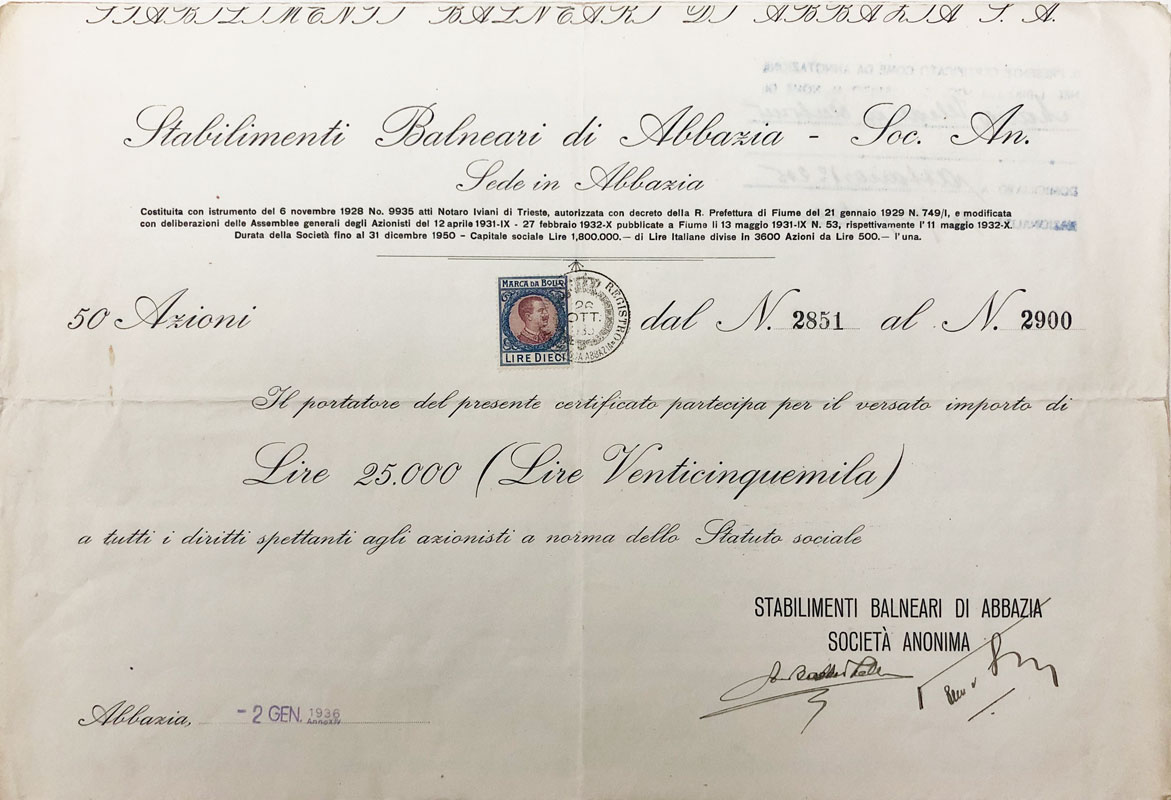Opis: OPATIJA, dionica “KUPALIŠTA OPATIJA", 25 000 lira, 2. siječnja 1936., 37x25 cm