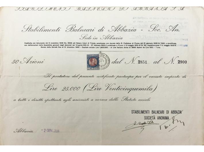• OPATIJA, dionica “KUPALIŠTA OPATIJA", 25 000 lira, 2. siječnja 1936., 37x25 cm