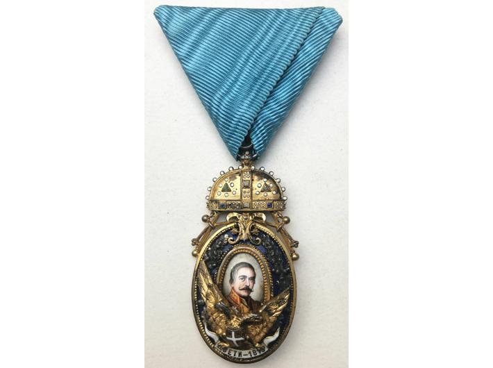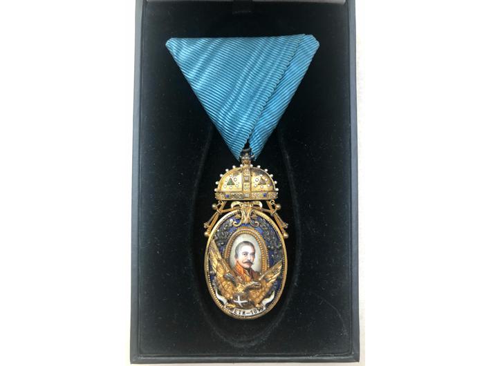 Opis: Orden Miloša Velikog IV. stupnja, proizvodnja Karl Fleischhacker, jedna od najvećih rijetkosti srpske, a i svjetske faleristike. Ustanovljen je 17.12.1898 godine i dodjeljivao se samo do 1903 kada ga ukida Petar I Karađorđević. Dodijeljeno je ukupno 255 odlikovanja svih redova. Mnogi su nakon 1903 uništeni, poznato nekoliko primjeraka 4. reda. Posljednji ponuđeni na aukciji ANDREAS THIES 2023 godine prodan za 37.000 eura + 25% komisija = 46.250 eura. Izvrsna kvaliteta, patina, bez popravaka ili tragova nošenja. Vrhunski primjerak za vrhunsku zbirku.