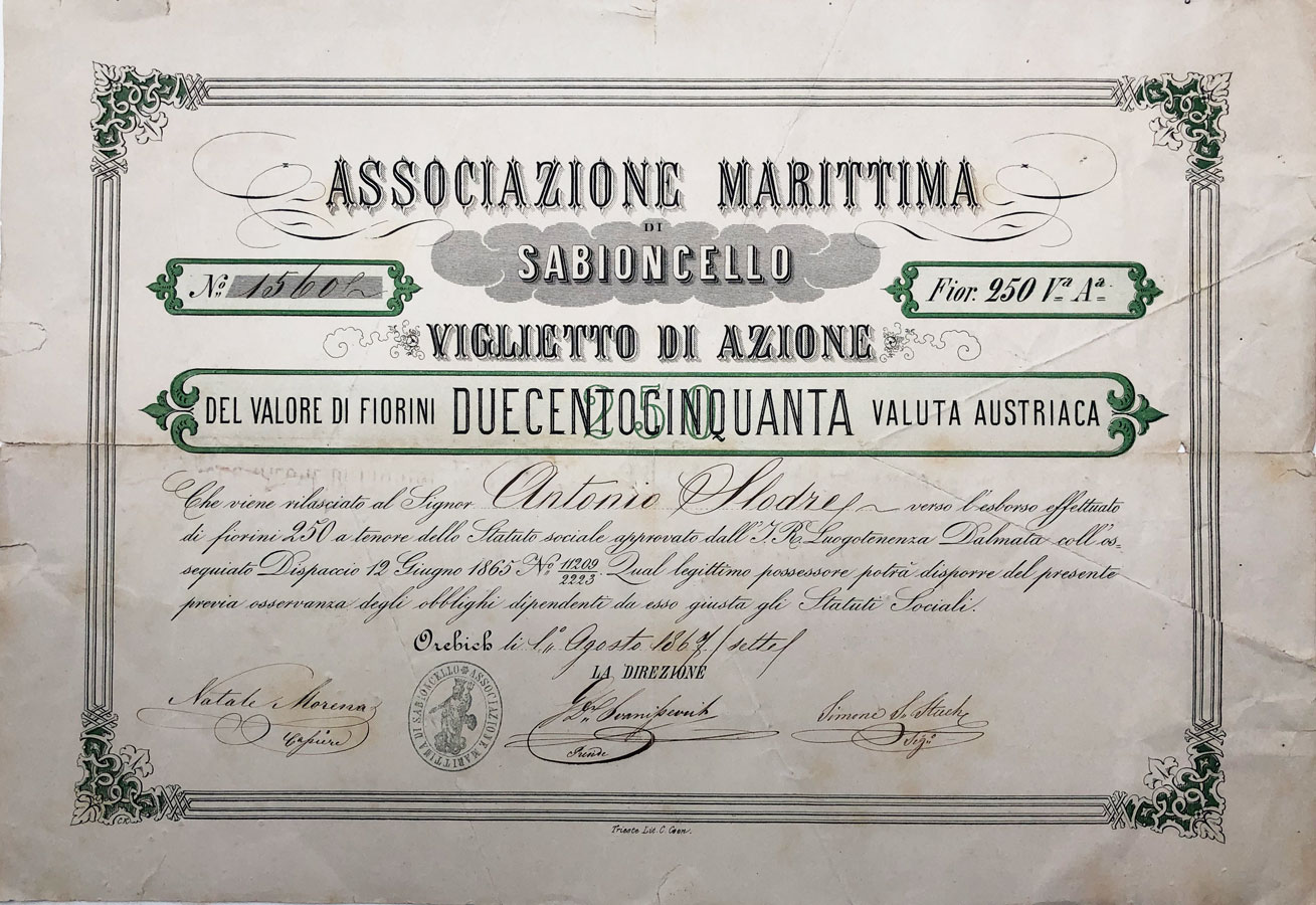 OREBIĆ, dionica “ASSOCIAZIONE MARITTIMA DI SABIONCELLO / POMORSKO DRUŠTVO U OREBIĆU", 250 fiorina, 01. kolovoz 1867., 41x28 cm Opis: OREBIĆ, dionica “ASSOCIAZIONE MARITTIMA DI SABIONCELLO / POMORSKO DRUŠTVO U OREBIĆU", 250 fiorina, 01. kolovoz 1867., 41x28 cm OREBIĆ, dionica “ASSOCIAZIONE MARITTIMA DI SABIONCELLO / POMORSKO DRUŠTVO U OREBIĆU", 250 fiorina, 01. kolovoz 1867., 41x28 cm Aukcija: Aukcija br. 67 - Numizmatika, militarija Kataloški broj: 196 Kategorija: Dionice - Hrvatska Trenutna ponuđena cijena je 75EUR, ukoliko želite dati svoju ponudu ona mora biti barem 80EUR ili veća. Upišite vrijednost vaše ponude: Ostali predmeti iz kategorije: Dionice - Hrvatska 196 75 EUR 197 90 EUR 198 85 EUR 199 35 EUR 200 70 EUR 201 25 EUR 202 30 EUR 203 15 EUR 204 15 EUR 205 100 EUR 206 35 EUR 207 12 EUR 208 12 EUR 209 12 EUR 210 5 EUR 211 15 EUR 212 15 EUR 213 20 EUR 214 15 EUR 215 10 EUR
