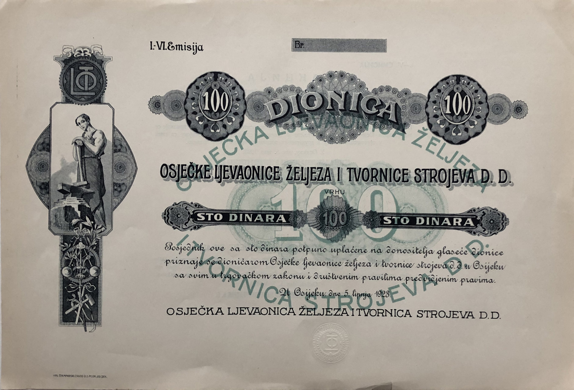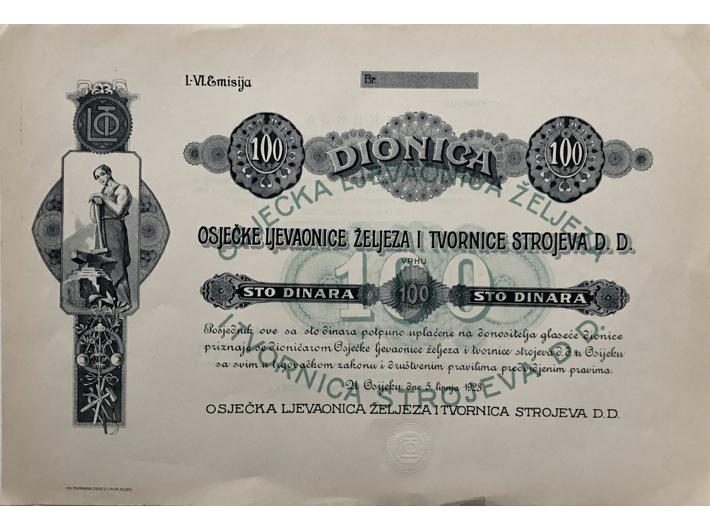• OSIJEK, dionica "Osječka ljevaonica željeza i tvornica strojeva" d.d., 100 dinara, 5.6.1923., 40x27 cm