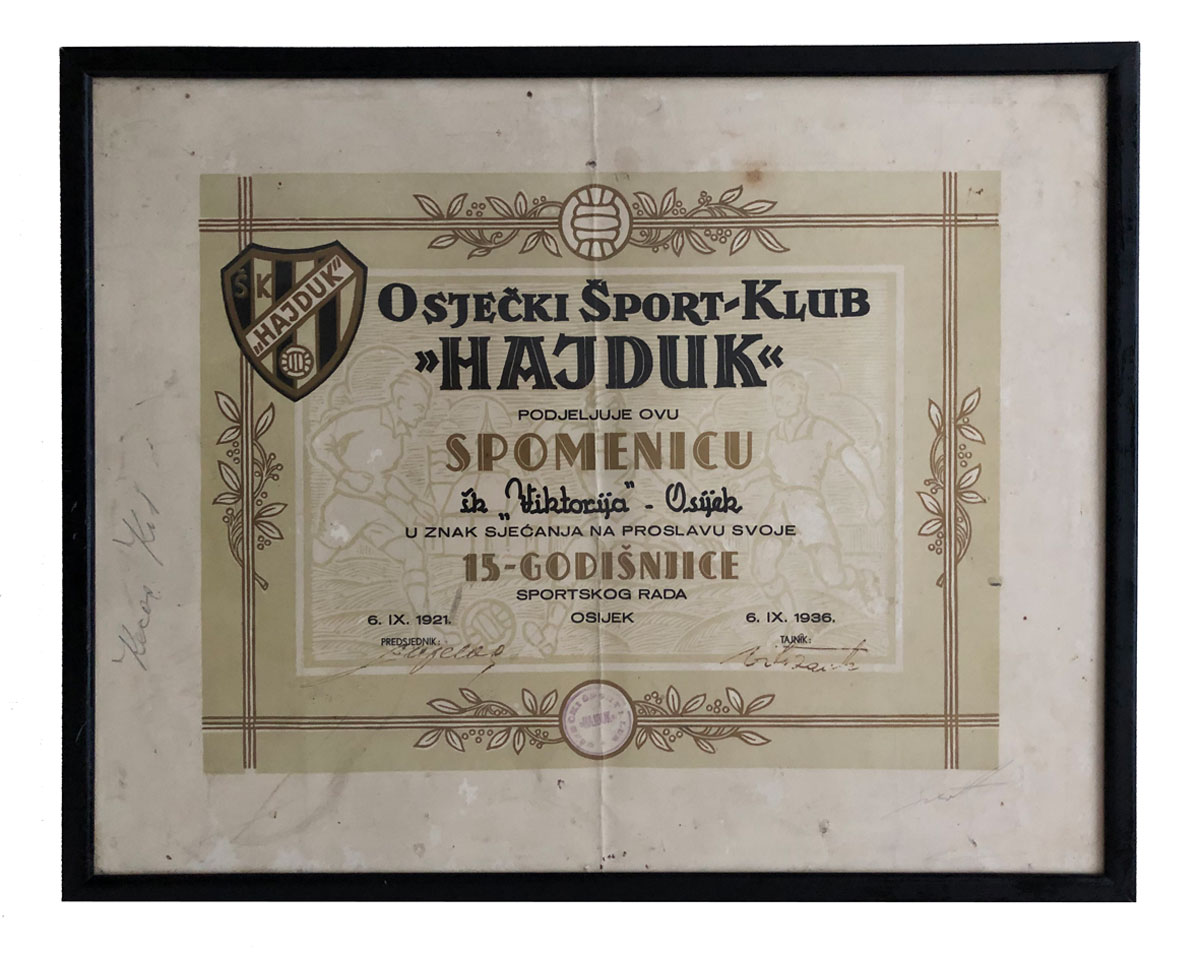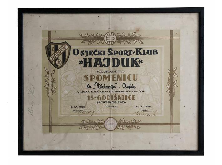 OSIJEK, nogometni klub HAJDUK 1936. godina, prekrasna diploma-spomenica za 15 godina rada "Viktorije" Osijek. Uramljeno 47x28 cm. UNIKAT Opis: OSIJEK, nogometni klub HAJDUK 1936. godina, prekrasna diploma-spomenica za 15 godina rada "Viktorije" Osijek. Uramljeno 47x28 cm. UNIKAT OSIJEK, nogometni klub HAJDUK 1936. godina, prekrasna diploma-spomenica za 15 godina rada "Viktorije" Osijek. Uramljeno 47x28 cm. UNIKAT Aukcija: Aukcija br. 64 - Numizmatika, militarija Kataloški broj: 495 Kategorija: Nogomet Trenutna ponuđena cijena je 80EUR, ukoliko želite dati svoju ponudu ona mora biti barem 80EUR ili veća. Upišite vrijednost vaše ponude: Ostali predmeti iz kategorije: Nogomet 487 200 EUR 488 150 EUR 489 200 EUR 490 100 EUR 491 200 EUR 492 100 EUR 493 50 EUR 494 100 EUR 495 80 EUR 496 3500 EUR 497 15 EUR