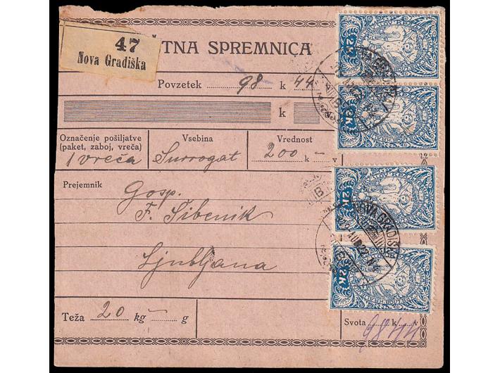 Paketna karta za paket upućen iz Nove Gradiške u Ljubljanu 22.08. 1919. Opis: Paketna karta za paket upućen iz Nove Gradiške u Ljubljanu 22.08. 1919. Zanimljiva frankatura, dobra kvaliteta. Paketna karta za paket upućen iz Nove Gradiške u Ljubljanu 22.08. 1919. Aukcija: Aukcija br. 63 - Filatelija i razglednice Kataloški broj: 128 Kategorija: SHS Hrvatska Kvaliteta: ✉ Trenutna ponuđena cijena je 18EUR, ukoliko želite dati svoju ponudu ona mora biti barem 20EUR ili veća. Upišite vrijednost vaše ponude: Ostali predmeti iz kategorije: SHS Hrvatska **/* 98 2300 EUR **/* 99 650 EUR ** 100 70 EUR ☉ 101 35 EUR ✉ 102 55 EUR ✉ 103 50 EUR ✉ 104 25 EUR ✉ 105 60 EUR **/* 106 30 EUR ** 107 30 EUR ✉ 108 25 EUR ✉ 109 25 EUR ✉ 110 25 EUR ✉ 111 25 EUR ✉ 112 25 EUR ✉ 113 30 EUR ✉ 114 20 EUR ✉ 115 16 EUR ✉ 116 25 EUR ✉ 117 30 EUR 123→