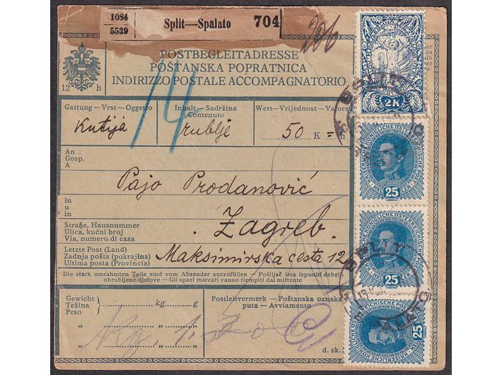 Opis: Paketna karta za paket upućen iz Splita u Zagreb 13.08. 1919. Mješovito frankirana austrijskim i markama SHS verigari. Dobra kvaliteta.