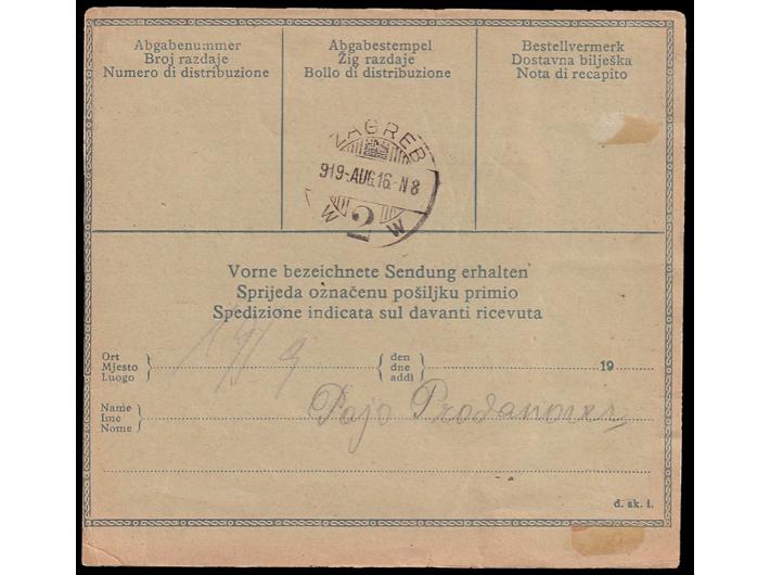 Paketna karta za paket upućen iz Splita u Zagreb 13.08. 1919.