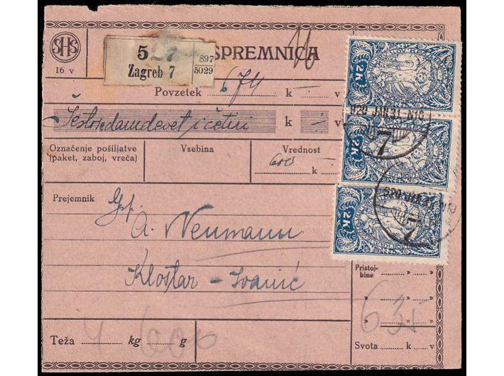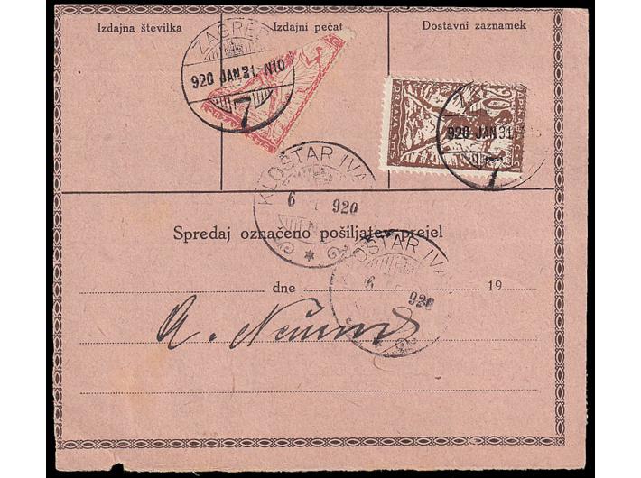 Paketna karta za paket upućen iz Zagreba u Kloštar Ivanić 31.01. 1920. Opis: Paketna karta za paket upućen iz Zagreba u Kloštar Ivanić 31.01. 1920. Na poleđini frankirano i polovinom marke od 30 vinara. Dobra kvaliteta, zanimljiva frankatura. Paketna karta za paket upućen iz Zagreba u Kloštar Ivanić 31.01. 1920. Aukcija: Aukcija br. 63 - Filatelija i razglednice Kataloški broj: 129 Kategorija: SHS Hrvatska Kvaliteta: ✉ Trenutna ponuđena cijena je 16EUR, ukoliko želite dati svoju ponudu ona mora biti barem 16EUR ili veća. Upišite vrijednost vaše ponude: Ostali predmeti iz kategorije: SHS Hrvatska **/* 98 2300 EUR **/* 99 650 EUR ** 100 70 EUR ☉ 101 35 EUR ✉ 102 55 EUR ✉ 103 50 EUR ✉ 104 25 EUR ✉ 105 60 EUR **/* 106 30 EUR ** 107 30 EUR ✉ 108 25 EUR ✉ 109 25 EUR ✉ 110 25 EUR ✉ 111 25 EUR ✉ 112 25 EUR ✉ 113 30 EUR ✉ 114 20 EUR ✉ 115 16 EUR ✉ 116 25 EUR ✉ 117 30 EUR 123→