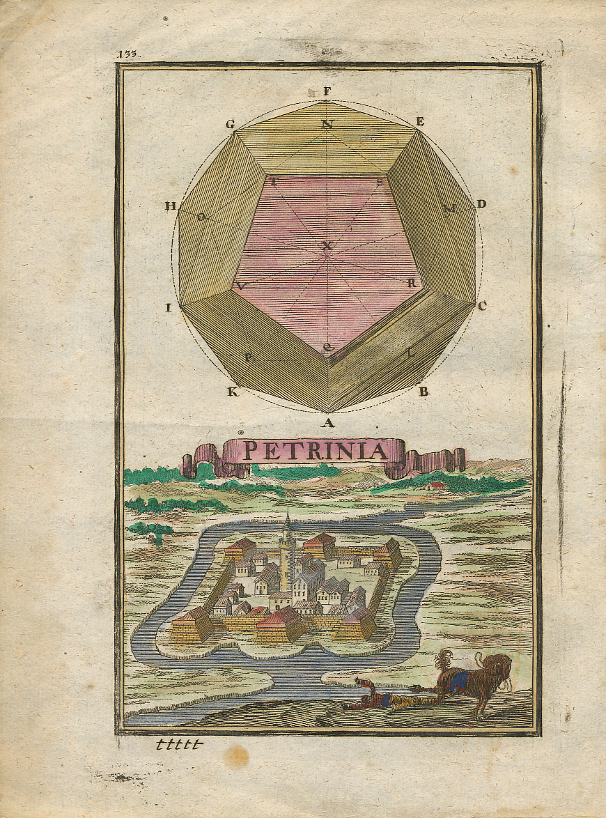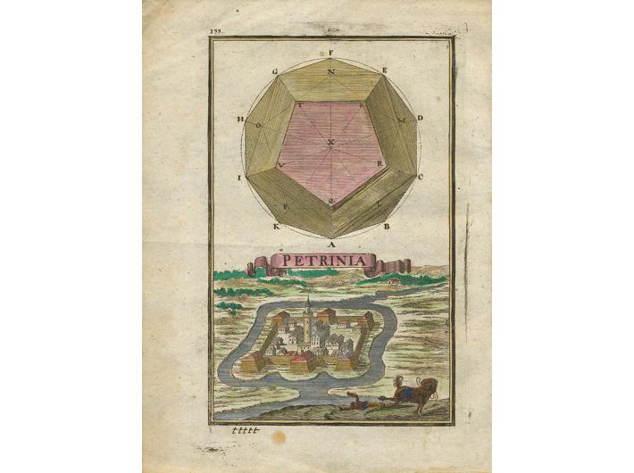 Opis: PETRINJA, Petrinia. Veduta Petrinje iz Birckenstein, Erzherzogliche Handgriffe. Beč, 1686., crtao Justus van der Nypoort. Knjiga iz koje dolazi ova veduta izdana je kao udžbenik geometrije za nadvojvodu Josipa, sina cara Leopolda I. Dimenzije slike 16x10,5 cm, dimenzije papira 20x15 cm. Stanje odlično.