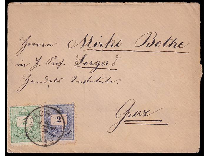Opis: Pismo s ukrasnim monogramom na poleđini dvobojno frankirano i upućeno iz Zagreba u Graz. Dolaz 01.03. 1885 na poleđini. Dobra kvaliteta.