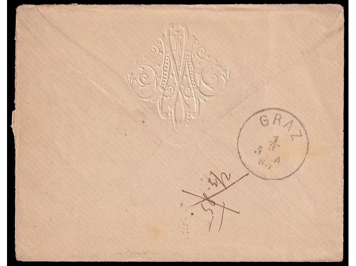 Pismo s ukrasnim monogramom na poleđini dvobojno frankirano i upućeno iz Zagreba u Graz.