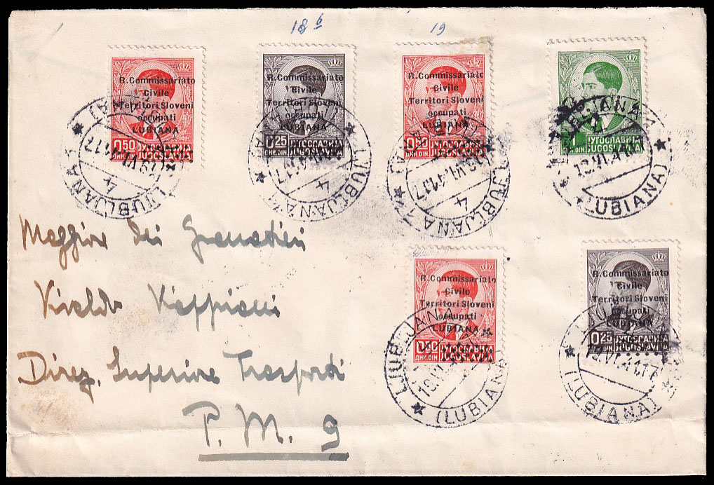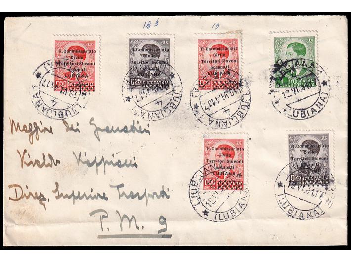Opis: Pismo upućeno iz Ljubljane 19.06. 1941. pripadniku vojne pošte P.M. 9. Zanimljva višebojna frankatura.