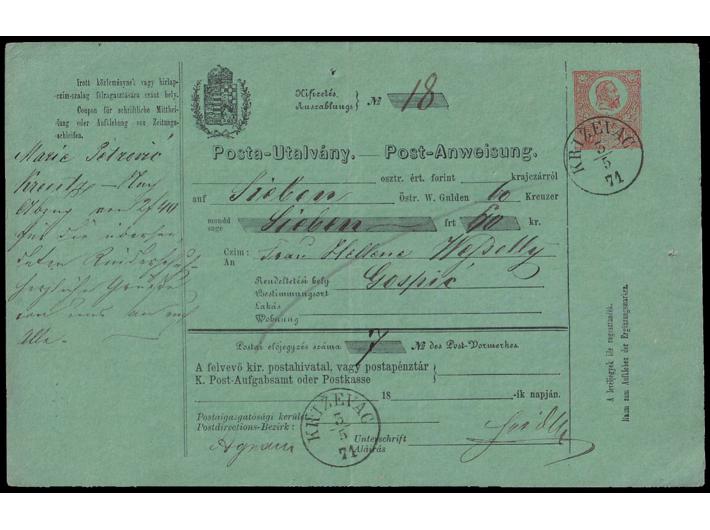 Poštanska uputnica za novac upućen iz Križevaca u Gospić 03.05. 1871. Opis: Poštanska uputnica za novac upućen iz Križevaca u Gospić 03.05. 1871. Rijedak poštanski dokument u dobroj kvaliteti. Poštanska uputnica za novac upućen iz Križevaca u Gospić 03.05. 1871. Aukcija: Aukcija br. 63 - Filatelija i razglednice Kataloški broj: 77 Kategorija: Hrvatska do 1918 Kvaliteta: ✉ Trenutna ponuđena cijena je 20EUR, ukoliko želite dati svoju ponudu ona mora biti barem 25EUR ili veća. Upišite vrijednost vaše ponude: Ostali predmeti iz kategorije: Hrvatska do 1918 ✉ 22 50 EUR ✉ 23 25 EUR ✉ 24 25 EUR ✉ 25 18 EUR ✉ 26 25 EUR ✉ 27 25 EUR ✉ 28 20 EUR ✉ 29 60 EUR ☉ 30 65 EUR ▲ 31 14 EUR ▲ 32 20 EUR ▲ 33 20 EUR ☉ 34 16 EUR ☉ 35 12 EUR ☉ 36 12 EUR ☉ 37 20 EUR ☉ 38 65 EUR ☉ 39 18 EUR ✉ 40 12 EUR ▲ 41 12 EUR 1234→