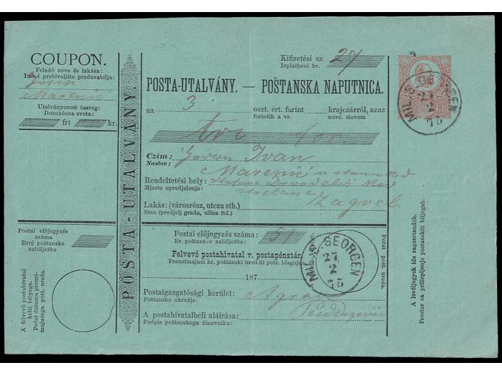 • Poštanska uputnica za novac upućen iz Mil.S. Georgen (Đurđevac) u Zagreb 27.02. 1875.