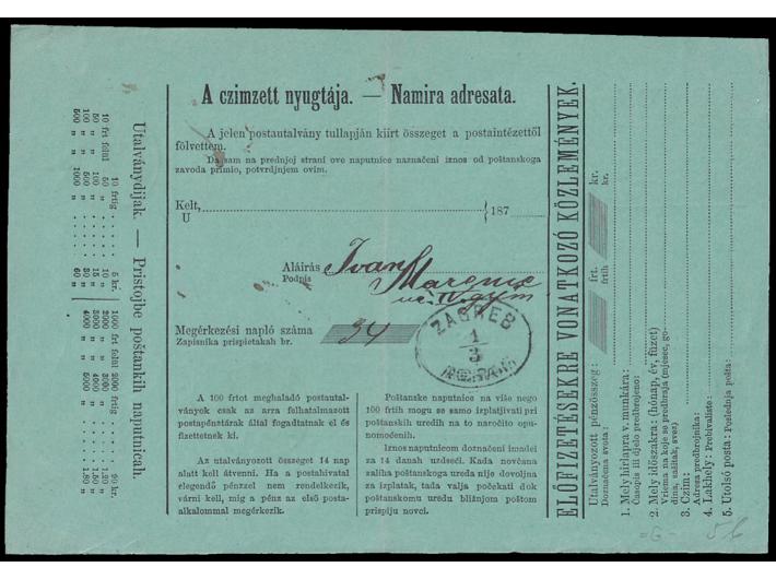 Opis: Poštanska uputnica za novac upućen iz Mil.S. Georgen (Đurđevac) u Zagreb 27.02. 1875. Dolaz na poleđini. Rijedak poštanski dokument u dobroj kvaliteti.