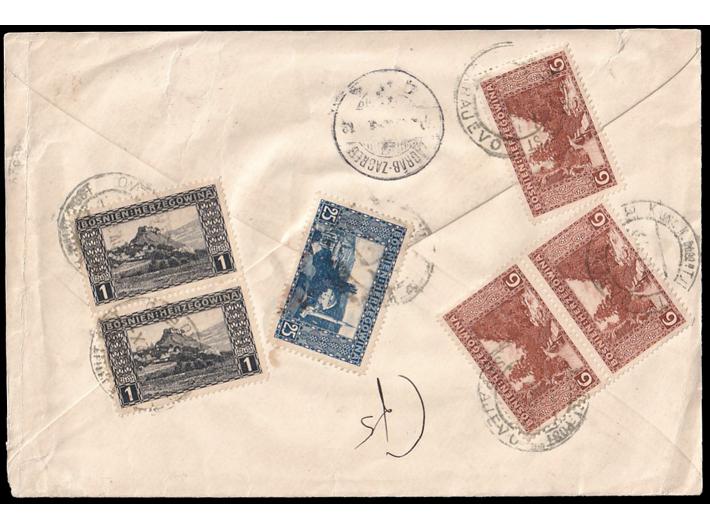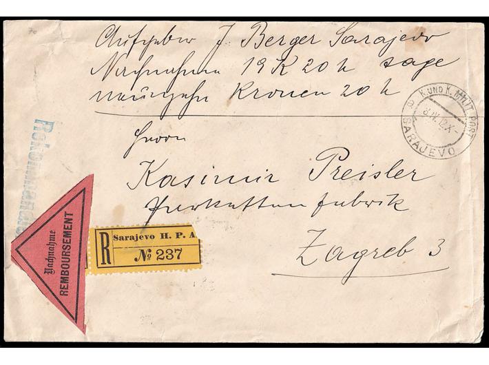 Opis: Preporučeno i s otkupninom upućeno pismo iz Sarajeva u Zagreb 03.04. 1912. Trobojna frankatura na poleđini. Rijetka kombinacija. Dolazni žig.