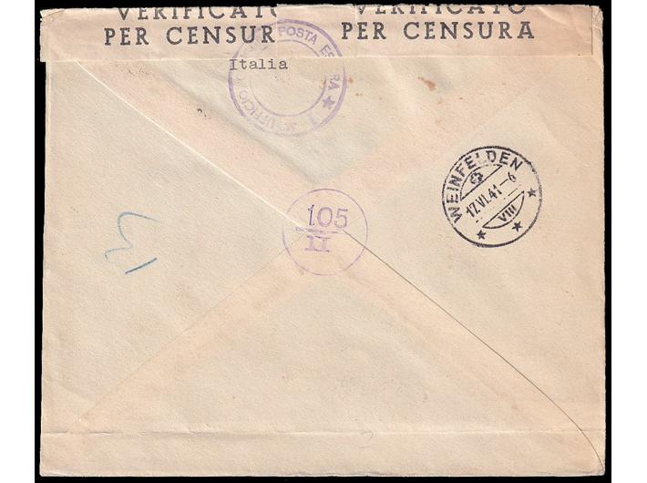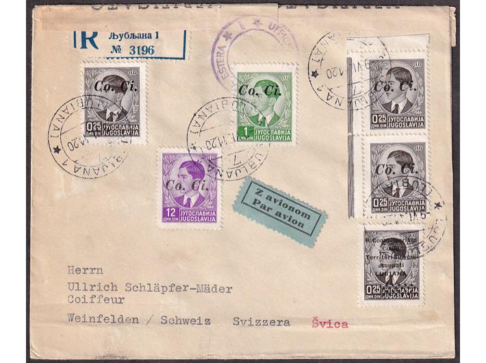 Opis: Preporučeno i zrakoplovom upućeno pismo iz Ljubljane u Weinfelden u Švicarskoj. Atraktivno frankirano s dva provizorna izdanja, cenzurirano po talijanskoj vojnoj cenzuri. Dolaz na poleđini. U donjem dijelu ispod adrese trag vodoravnog savijanja.