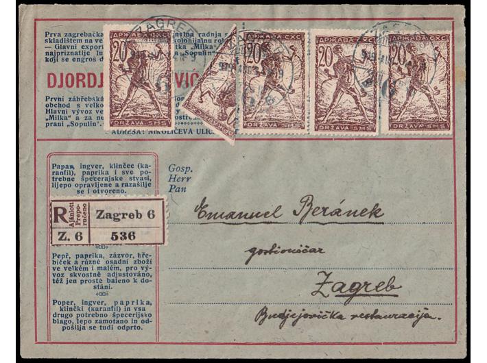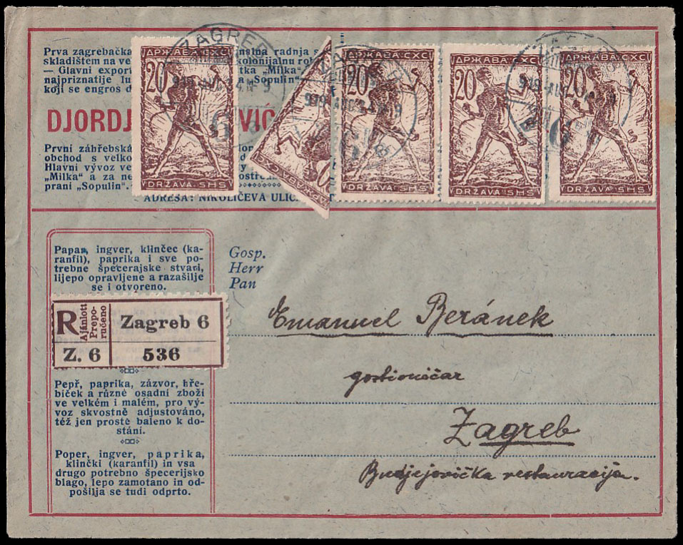Preporučeno pismo upućeno loko Zagreb 04.08. 1919. Opis: Preporučeno pismo upućeno loko Zagreb 04.08. 1919. Frankirano i polovicom marke od 20 vin. Reklamna koverta zagrebačkog trgovca kolonijalnom robom. Dolaz na poleđini. Preporučeno pismo upućeno loko Zagreb 04.08. 1919. Aukcija: Aukcija br. 63 - Filatelija i razglednice Kataloški broj: 127 Kategorija: SHS Hrvatska Kvaliteta: ✉ Trenutna ponuđena cijena je 40EUR, ukoliko želite dati svoju ponudu ona mora biti barem 45EUR ili veća. Upišite vrijednost vaše ponude: Ostali predmeti iz kategorije: SHS Hrvatska **/* 98 2300 EUR **/* 99 650 EUR ** 100 70 EUR ☉ 101 35 EUR ✉ 102 55 EUR ✉ 103 50 EUR ✉ 104 25 EUR ✉ 105 60 EUR **/* 106 30 EUR ** 107 30 EUR ✉ 108 25 EUR ✉ 109 25 EUR ✉ 110 25 EUR ✉ 111 25 EUR ✉ 112 25 EUR ✉ 113 30 EUR ✉ 114 20 EUR ✉ 115 16 EUR ✉ 116 25 EUR ✉ 117 30 EUR 123→