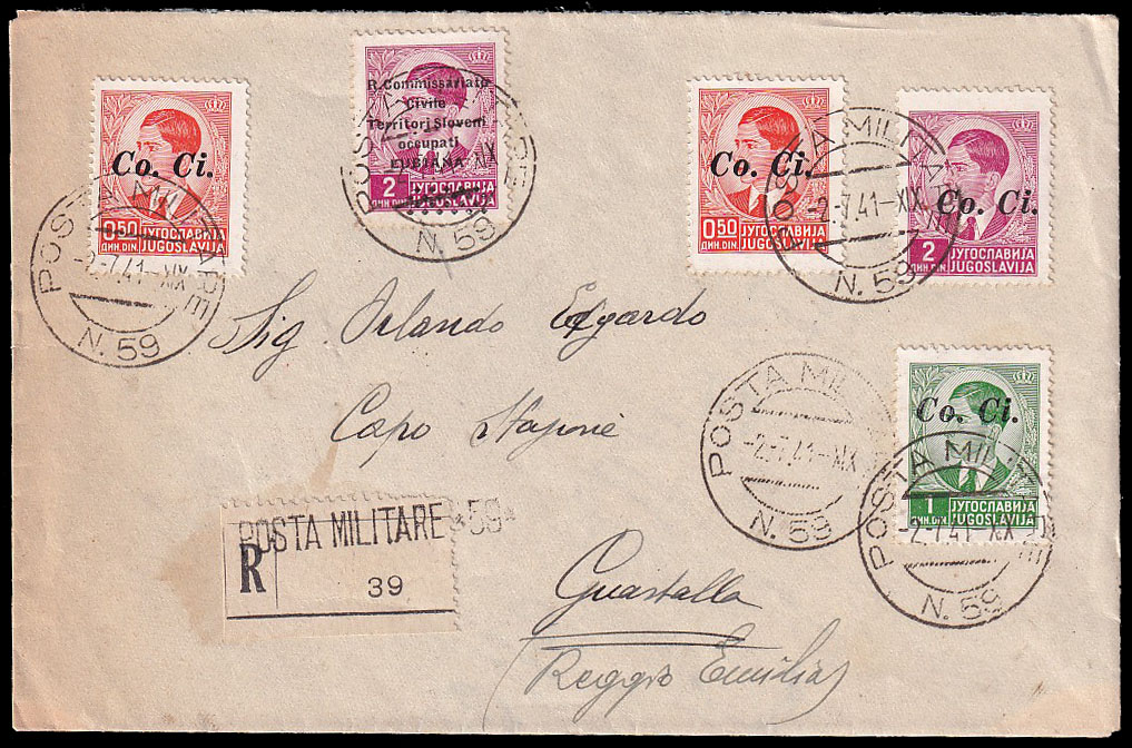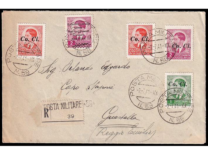 Opis: Preporučeno pismo upućeno s vojne pošte P.M. 59 u Italiju 02.07. 1941. Atraktivna višebojna frankatura dvaju provizornih izdanja. Tranziti i dolaz na poleđini.
