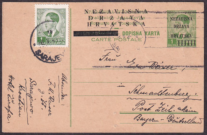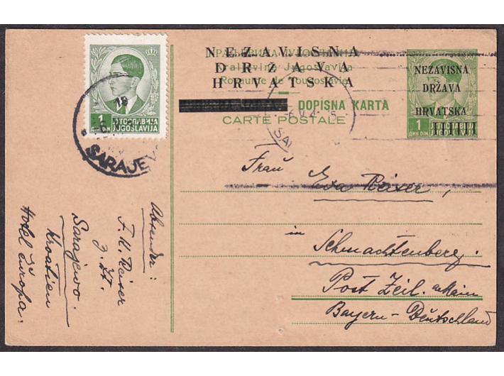 Provizorna dopisnica NDH dofrankirana markom 1 din. kraljevine Jugoslavije i upućena iz Sarajeva u Njemačku 06.05. 1941. Opis: Provizorna dopisnica NDH dofrankirana markom 1 din. kraljevine Jugoslavije i upućena iz Sarajeva u Njemačku 06.05. 1941. Dobra kvaliteta Provizorna dopisnica NDH dofrankirana markom 1 din. kraljevine Jugoslavije i upućena iz Sarajeva u Njemačku 06.05. 1941. Aukcija: Aukcija br. 63 - Filatelija i razglednice Kataloški broj: 187 Kategorija: Nezavisna Država Hrvatska Kvaliteta: ✉ Trenutna ponuđena cijena je 30EUR, ukoliko želite dati svoju ponudu ona mora biti barem 35EUR ili veća. Upišite vrijednost vaše ponude: Ostali predmeti iz kategorije: Nezavisna Država Hrvatska ✉ 180 60 EUR ✉ 181 20 EUR ✉ 182 20 EUR ✉ 183 20 EUR ✉ 184 25 EUR ✉ 185 20 EUR ✉ 186 20 EUR ✉ 187 30 EUR ** 188 40 EUR ** 189 130 EUR ** 190 75 EUR ** 191 35 EUR ** 192 40 EUR ** 193 30 EUR ** 194 100 EUR **/* 195 80 EUR ** 196 35 EUR * 197 50 EUR ✉ 198 20 EUR ✉ 199 25 EUR 123456789→