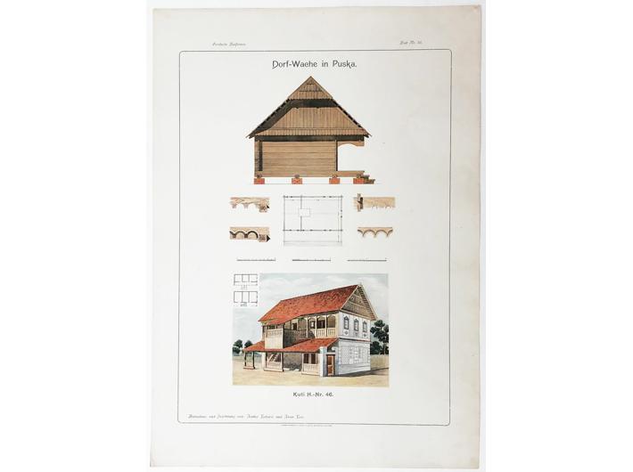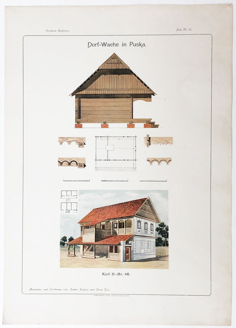 Opis: PUSKA, (autori: J. Kolarić i I. Kos) list iz mape hrvatske tradicijske arhitekture “Croatische Bauformen”,dimenzije 35x49 cm, izdanje Kroatischer Ingenieur- und Architekten- Verein; Dresden: Gerhard Kühtmann, 1911.