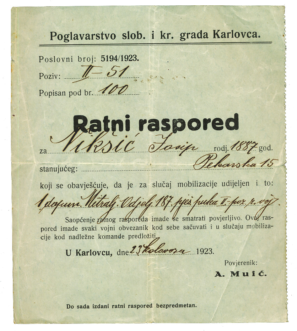 RATNI RASPORED, za stanovnika Karlovca u slučaju mobilizacije. Karlovac, 1923. Opis: RATNI RASPORED, za stanovnika Karlovca u slučaju mobilizacije. Karlovac, 1923. 15x17 cm. RATNI RASPORED, za stanovnika Karlovca u slučaju mobilizacije. Karlovac, 1923. Aukcija: Aukcija br. 67 - Numizmatika, militarija Kataloški broj: 536 Kategorija: Dokumenti i ostalo Trenutna ponuđena cijena je 8EUR, ukoliko želite dati svoju ponudu ona mora biti barem 8EUR ili veća. Upišite vrijednost vaše ponude: Ostali predmeti iz kategorije: Dokumenti i ostalo 524 40 EUR 525 75 EUR 526 45 EUR 527 100 EUR 528 10 EUR 529 10 EUR 530 150 EUR 531 35 EUR 532 120 EUR 533 20 EUR 534 12 EUR 535 20 EUR 536 8 EUR 537 17 EUR 538 40 EUR 539 6 EUR 540 30 EUR 541 30 EUR 542 60 EUR 543 25 EUR 1234→