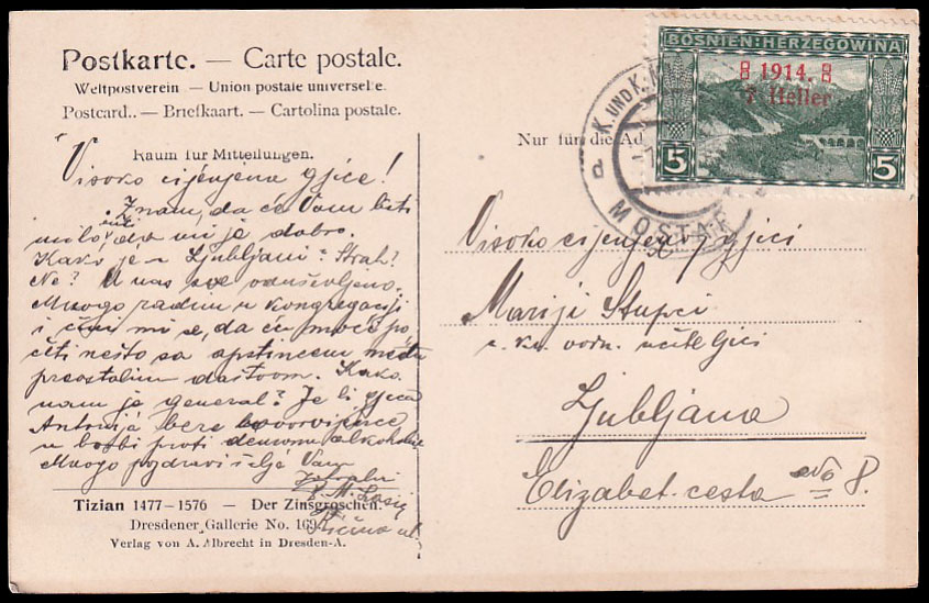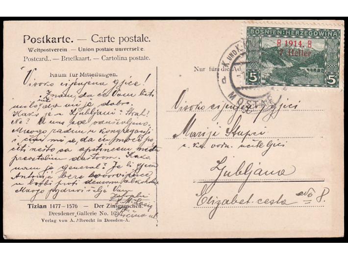 Razglednica frankirana provizornim izdanjem za 1914 i upućena iz Mostara u Ljubljanu 01.02. 1915.