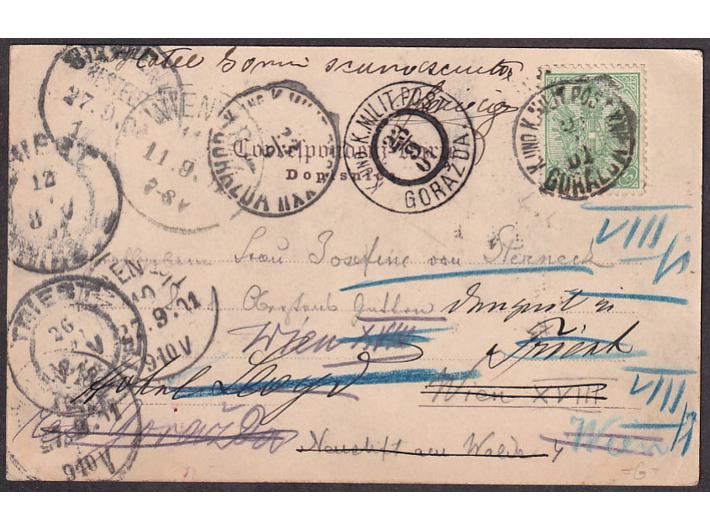 Razglednica Goražda upućena iz Goražda u Beč ?.09. 1901. Opis: Razglednica Goražda upućena iz Goražda u Beč ?.09. 1901. Preadresirana za Trst pa opet za Beč i na kraju vraćena u Goražde 23.09. da bi ponovno bila upućena u Trst. Vrlo zanimljivo i atraktivno. Razglednica Goražda upućena iz Goražda u Beč ?.09. 1901. Aukcija: Aukcija br. 63 - Filatelija i razglednice Kataloški broj: 675 Kategorija: Bosna i Hercegovina Kvaliteta: ✉ Trenutna ponuđena cijena je 25EUR, ukoliko želite dati svoju ponudu ona mora biti barem 25EUR ili veća. Upišite vrijednost vaše ponude: Ostali predmeti iz kategorije: Bosna i Hercegovina * 618 100 EUR * 619 40 EUR ** 620 45 EUR ** 621 200 EUR * 622 40 EUR **/* 623 120 EUR * 624 150 EUR ** 625 25 EUR * 626 50 EUR ** 627 50 EUR ** 628 40 EUR * 629 30 EUR * 630 30 EUR **/* 631 70 EUR * 632 100 EUR * 633 40 EUR ** 634 60 EUR * 635 20 EUR * 636 20 EUR ** 637 25 EUR 1234→