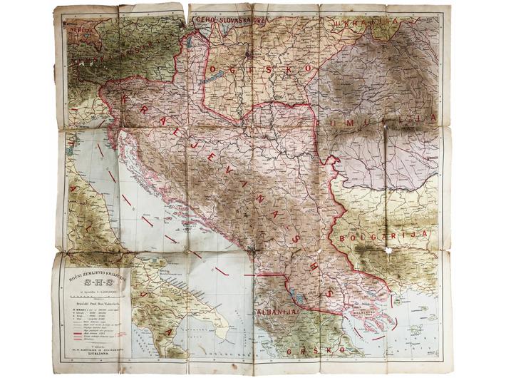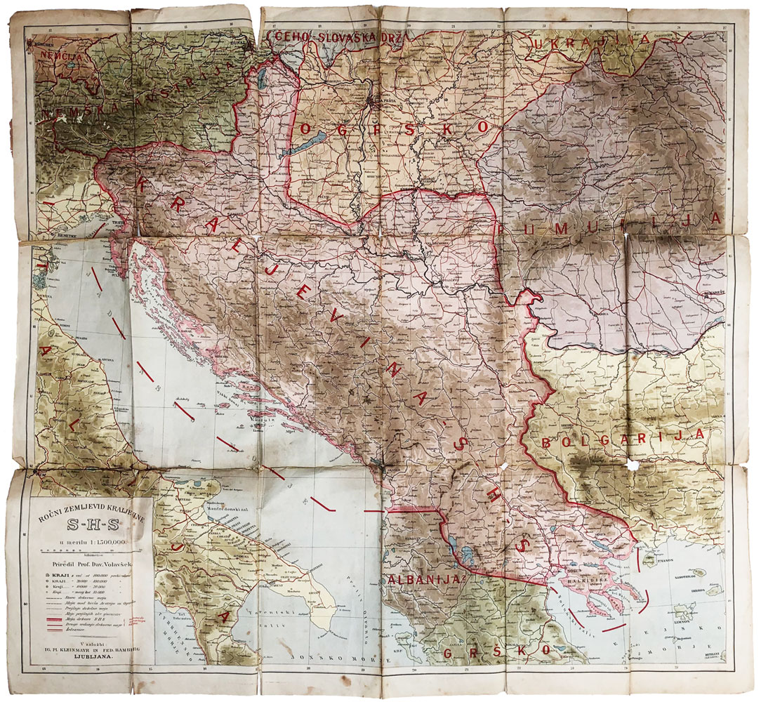 Opis: Ročni zemljevid kraljevine S.H.S. od D. Volavšeka. Zemljovid Kraljevine SHS prije mirovne konferencije u Versaju. Izuzetna rijetkost, loše stanje (poderotine, selotejp itd.) ali kompletna. Sloveniji je dodano cijelo Gradišće i Istra, a Srbiji Solun i Halkidski poluotok. Izuzetna rijetkost, kartu spominju samo Geografske novice iz 1925. godine: "Davorin Volavšek: Ročni zemljevid kraljevine S.H.S. v merilu 1 :1,500.000. Ig. pl. Kleinmayr in Fed. Bamberg. Ljubljana (1919). Naše državne meje so popolnoma napačne, pač v smislu naših narodnih teženj pred početkom mirovne konference. Karto odlikuje z redkimi izjemami pravilna označba krajev. Zarisane so tudi meje glavarstev. Nedosledno so vrisane le nekatere lokalne železnice. Netočno je označena lega Novega Mesta. Neumestni sta označbi Dvor (Št. Janž) in Alsó-lendva (Dolnja Lendava)."