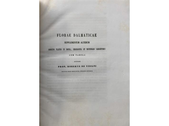 Opis: Roberto de Visiani: Florae Dalmaticae, supplementum alterum adjectis plantis in Bosnia, Hercegovina et Montenegro crescentibus cum tabula, 1876. Drugi (od tri) dodatka Visianijeva najvažnijeg djela - Flora Dalmatica. Objavljivanjem triju svezaka djela Flora Dalmatica (Leipzig, Vol. I = 1842., Vol. II = 1847., Vol. III = 1852.) Visiani nije završio rad na istraživanju dalmatinske flore, već je istraživanja proširio na susjedne Bosnu, Hercegovinu i Crnu Goru, pa još triput objavio dodatke (Supplementa, 1872., 1876. (predmetni svezak), i 1882. (posthumno) - sva tri sveska objavljena u časopisu Memorie del Reale Istituto Veneto di Scienze, Lettere ed Arti). Predmetni svezak, posebni otisak iz vol. 20, br. 1 navedenog časopisa, sadrži abecedno kazalo na kraju te presavinuti list s crtežima dviju biljaka (Ornithogalum Visianicum i Orchis Grisebachii). Numeracija stranica slijedi numeraciju stranica u časopisu. Tvrdu kartonski uvez, 117-219 str. 24,5x32,5 cm. Stanje odlično.