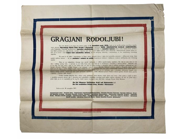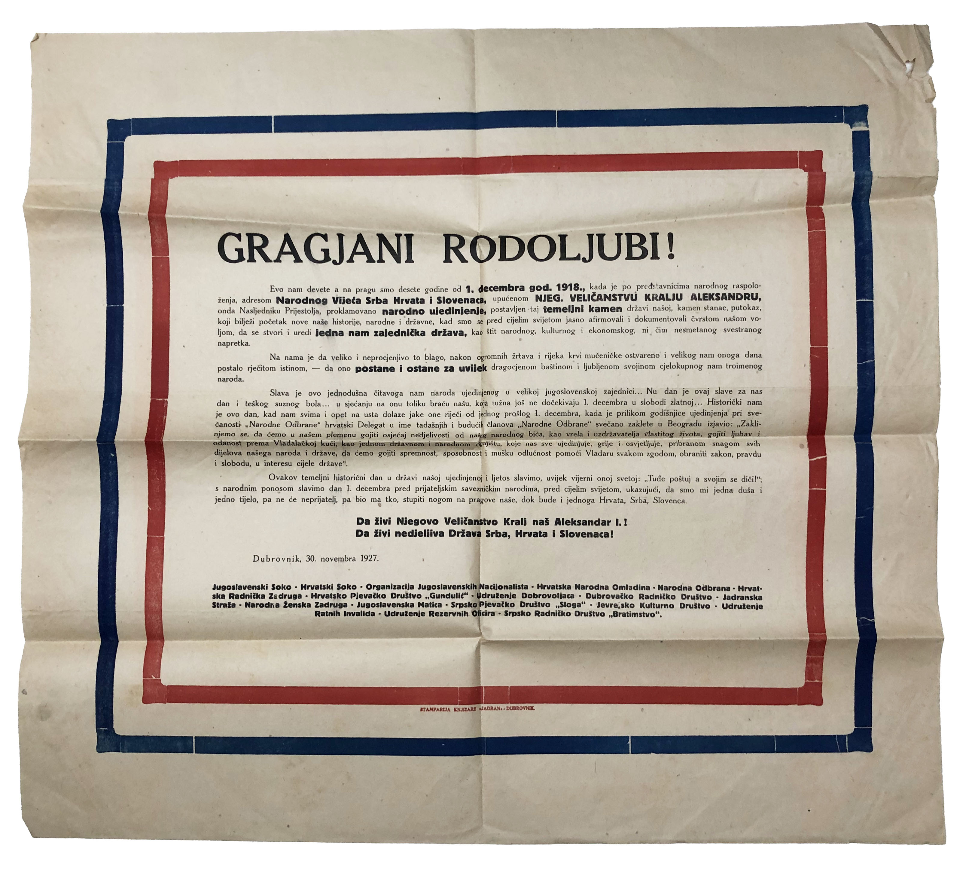 SHS, plakat Gragjani rodoljubi! Dubrovnik, 30. studeni 1927. Opis: SHS, Gragjani rodoljubi! Plakat, koji veliča jedinstvo i nedjeljivost države Srba, Hrvata i Slovenaca, izdan u Dubrovniku 30. studenog 1927. povodom proslave devetgodišnjice osnutka države SHS. 63x57 cm. SHS, plakat Gragjani rodoljubi! Dubrovnik, 30. studeni 1927. Aukcija: Aukcija br. 70 - Numizmatika, militarija Kataloški broj: 2281 Kategorija: Dokumenti, fotografije i ostalo Trenutna ponuđena cijena je 50EUR, ukoliko želite dati svoju ponudu ona mora biti barem 50EUR ili veća. Upišite vrijednost vaše ponude: Ostali predmeti iz kategorije: Dokumenti, fotografije i ostalo 2279 55 EUR 2280 25 EUR 2281 50 EUR 2282 95 EUR 2283 60 EUR 2284 350 EUR 2285 150 EUR 2286 10 EUR 2287 10 EUR 2288 45 EUR 2289 85 EUR 2290 25 EUR 2291 340 EUR 2292 1000 EUR 2293 2400 EUR 2294 2000 EUR 2295 12 EUR 2296 8 EUR 2297 250 EUR 2298 14 EUR 1234→
