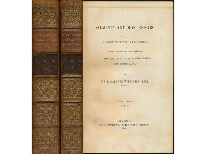 Opis: Sir John Gardner Wilkinson: Dalmatia and Montenegro with a Journey to Mostar in Herzegovina and the History of Dalmatia and Ragusa, the Uscocs, etc., Murray, London 1848, sv. I i II. Wilkinson je bio istaknuti egiptolog i član Kraljevskog društva. Bio je usmjeren izrazito protuturski, pa su ga Dalmacija, Dubrovnik i Crna Gora zanimale prvenstveno kao zemlje koje su se uspjele odhrvati otomanskim osvajanjima. Za razliku od R. Adama, kojeg su zanimali isključivo ostaci rimske kulture ili A. Fortisa, kojeg su zanimali narodni običaji i prirodni fenomeni, Wilkinson je usredotočen mnogo više na ljude, jezik, političke događaje i ulogu stanovništva u povijesnim zbivanjima. Knjiga sadrži mnogobrojne ilustracije, od kojih su neke preklopne, te veliki preklopni zemljovid. Oba sveska u istom orig. kožnatom uvezu sa zlatotiskom na koricama i rebrastom hrptu, te mramoriranim rubovima stranica, 364 + 454 str. Izvrsno stanje. Dimenzije 22x14 cm.