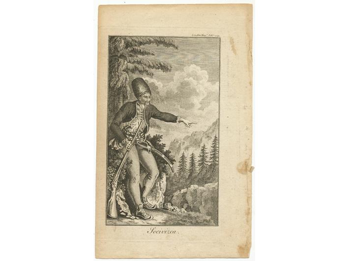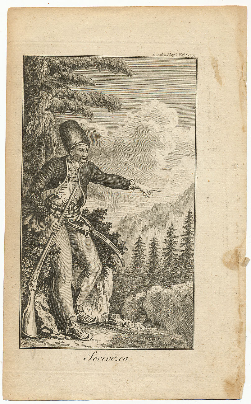 Opis: STANKO SOČIVICA, slavni hajduk poznat širom Europe. Ivan Lovrić, žestoki kritičar Alberta Fortisa, napisao je Sočivićinu biografiju 1776. i odmah je bila prevedena na nizozemski i njemački, a ovaj portret izašao je u časopisu „London Magazine“ 1779. uz opis njegovih podviga. Dimenzije 15,5X9,5 cm.