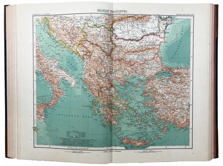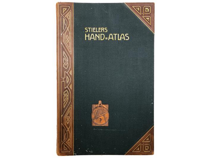 Opis: Stielers Hand-Atlas. Gotha: Justus Perthes, 1906. Deveto izdanje. Izvrsno očuvan primjerak najpoznatijeg njemačkog atlasa svijeta kraja 19. i prve polovice dvadesetog stoljeća. Izdanje u tvrdom uvezu s kožnom hrbati i zlatotiskom, te ukrasnim monogramom izdavača "Justus Perthus". 26x40,5 cm. Stanje odlično.