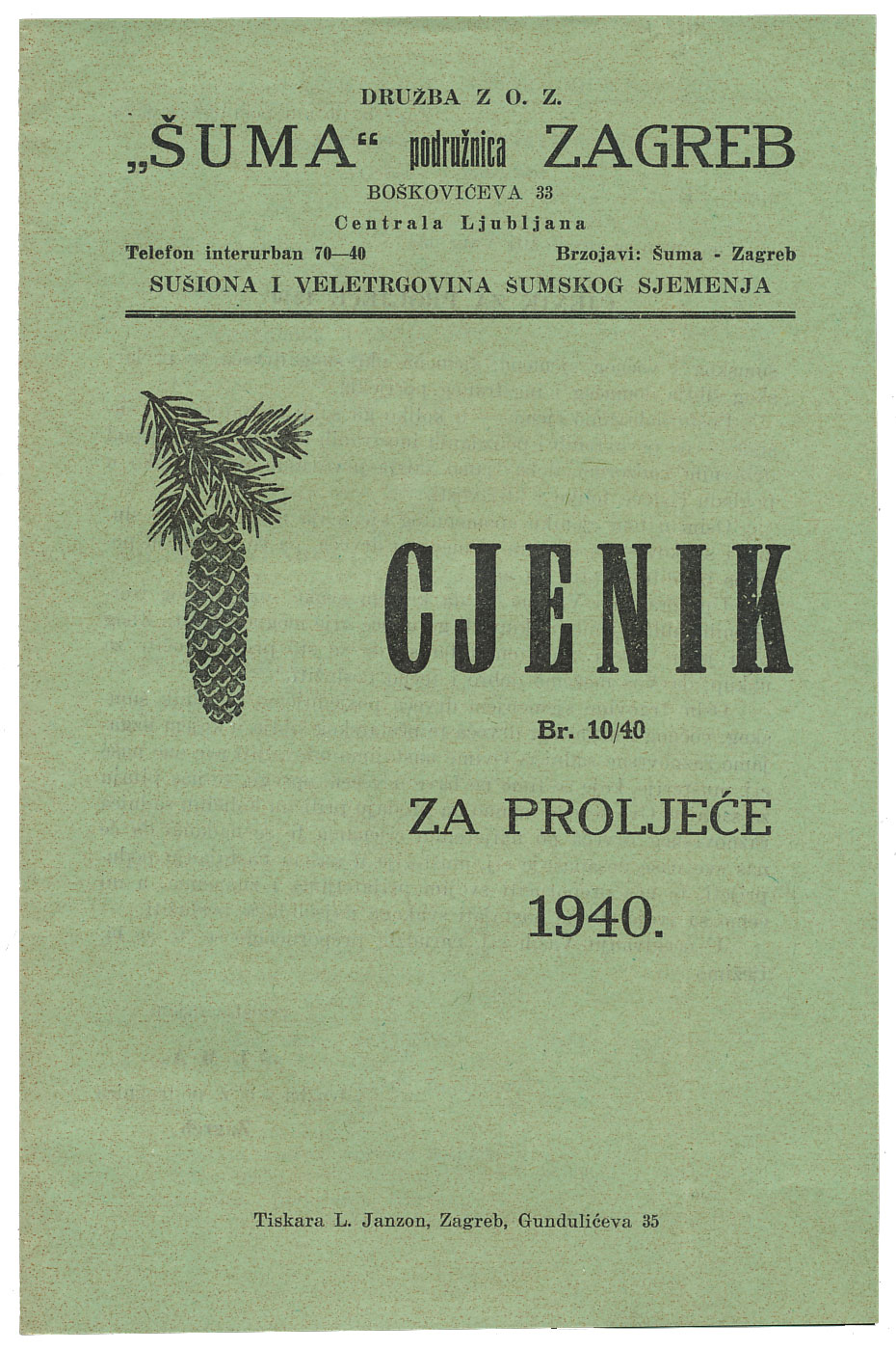 "ŠUMA", cijenik sušione i veletrgovine šumskog sjemenja. Zagreb, 1940.