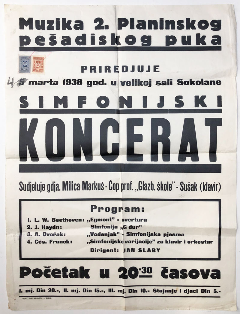 SUŠAK, plakat za koncert, 1938. Opis: SUŠAK, plakat za koncert Muzika 2 Planinskog Pešadiskog puka u velikoj sali "Sokolane", 4. III. 1938. Odlično stanje. 47x62 cm SUŠAK, plakat za koncert, 1938. Aukcija: Aukcija br. 65 - Knjige, zemljovidi, plakati Kataloški broj: 1075 Kategorija: Rijeka i Kvarner Trenutna ponuđena cijena je 50EUR, ukoliko želite dati svoju ponudu ona mora biti barem 55EUR ili veća. Upišite vrijednost vaše ponude: Ostali predmeti iz kategorije: Rijeka i Kvarner 1059 70 EUR 1060 70 EUR 1061 30 EUR 1062 25 EUR 1063 150 EUR 1064 50 EUR 1065 10 EUR 1066 50 EUR 1067 160 EUR 1068 40 EUR 1069 22 EUR 1070 65 EUR 1071 16 EUR 1072 40 EUR 1073 35 EUR 1074 40 EUR 1075 50 EUR 1076 70 EUR 1077 40 EUR 1078 15 EUR 12→